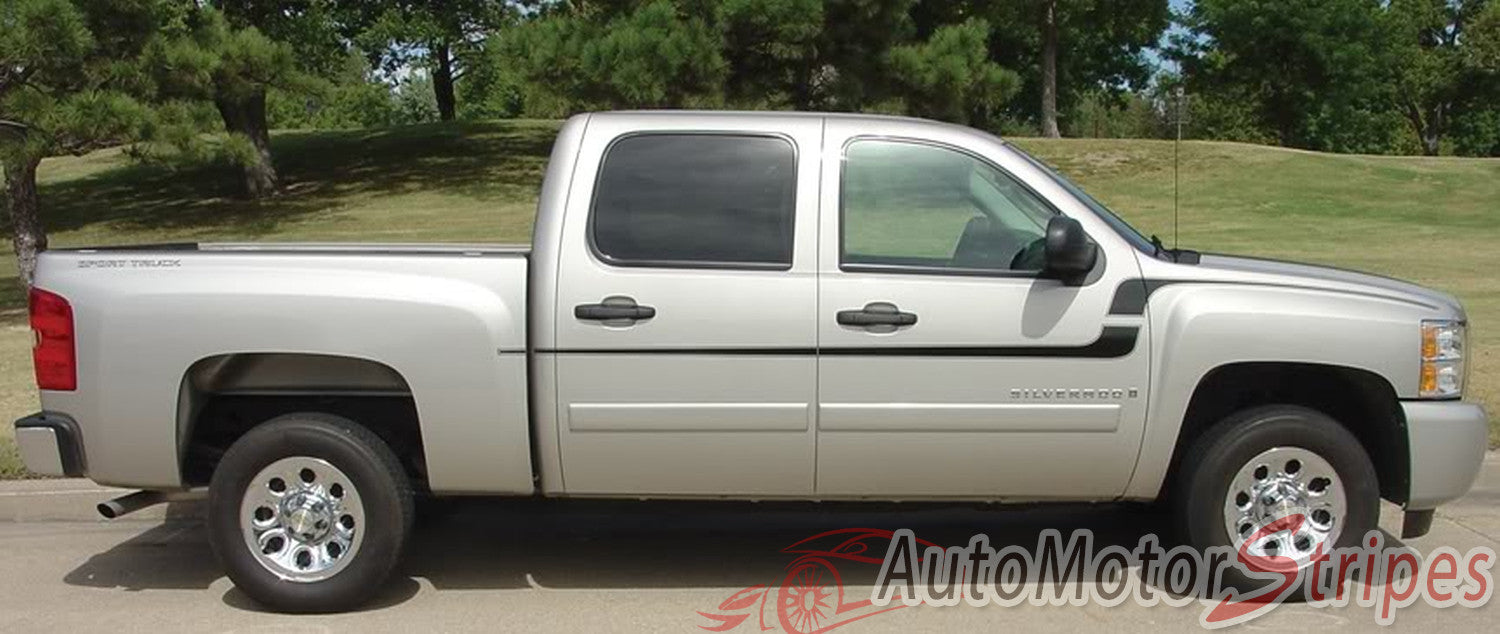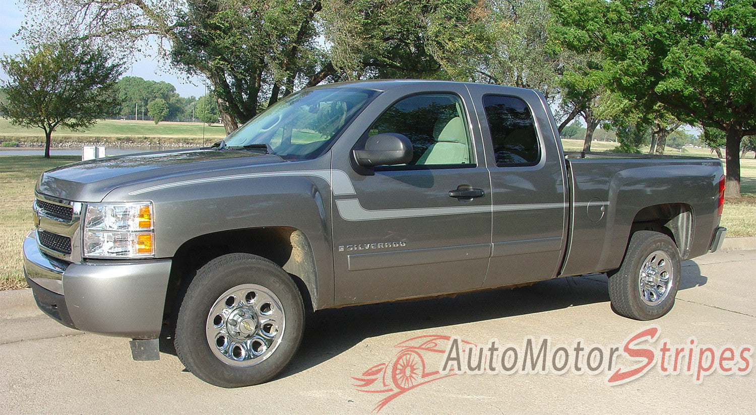 • FLEX vinyl graphic and striping packages, brand new from AutoMotorStripes!  Chevy Silverado, a name you can trust! Make your new truck stand out from the crowd in your town by adding this side fender and door trim vinyl graphic design! This vinyl graphic striping design has an upgraded custom factory OE graphic decal style, and is a very popular accent striping package for our local Chevy auto dealers. These plain Silverados need a popular selling vinyl stripe package to help these dealers sell the current generation of Chevy Silverados! Much time, effort and skill has gone into patiently and properly measuring this vinyl graphic style for precision fitment, and designed to fit the 2007 2008 2009 2010 2011 2012 2013 2014 2015 2016 2017 2018 Chevy Silverado 1500 truck and in some cases the GMC Sierra as well. See precise fitment for the exact model/year mentioned above. Please remember to also choose the correct vinyl decal options for your particular Chevy Silverado Truck model from those in the menu shown above. The vinyl decal sections sections included with this vehicle specific vinyl graphic kit are driver and passenger side graphic decals. You can now choose the options needed from the menu before adding to your cart, including the premium cast vinyl grade needed. This design is based on a classic, and is an exterior accessory for the Chevy Silverado Truck model and gives it a very modern day upgrade! Don't let your Silverado go another minute without these stylish vinyl graphics! You will receive many years of enjoyment with this weather resistant and durable custom factory vinyl style!