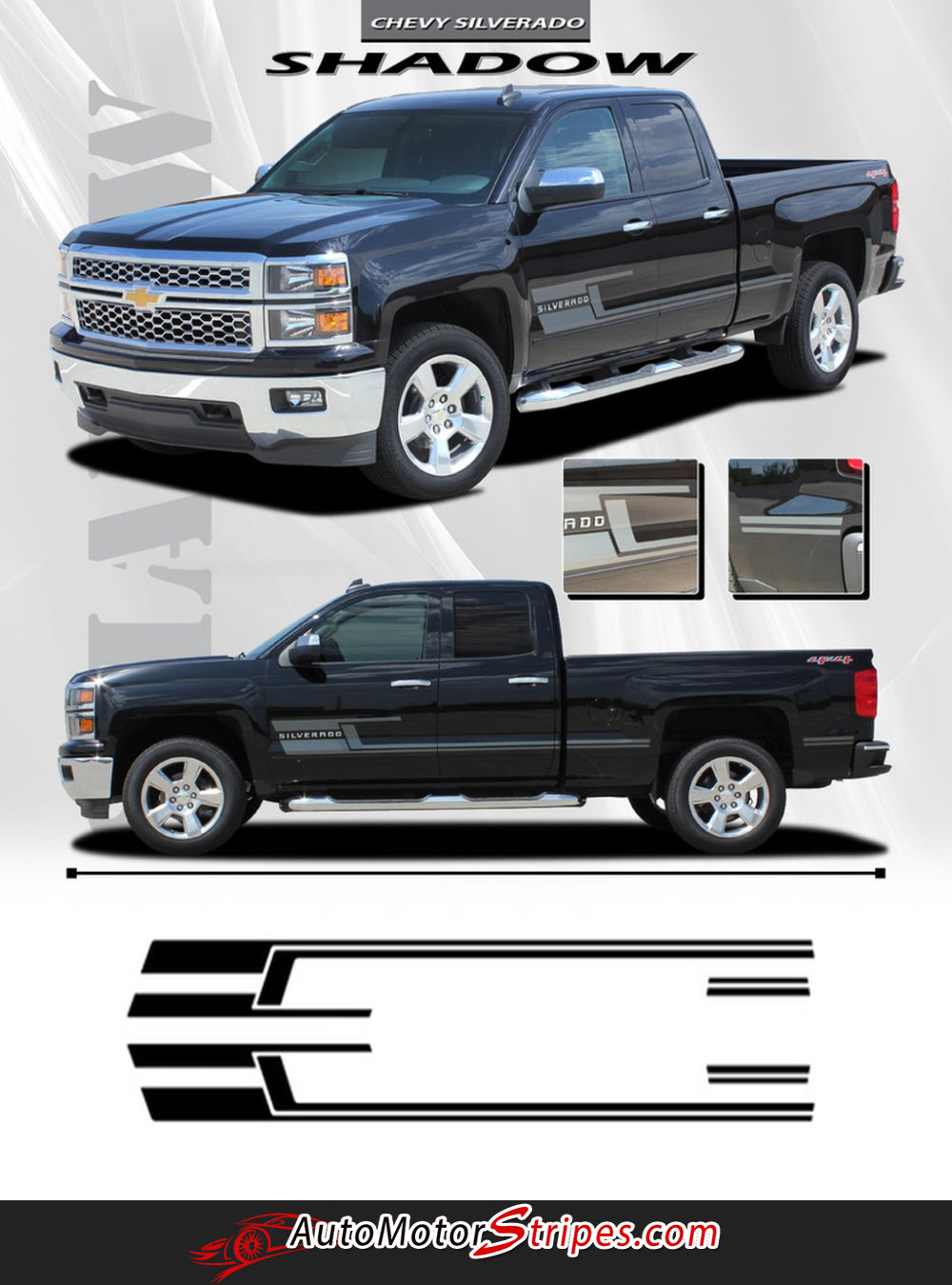 • SHADOW vinyl graphic and striping packages, brand new from AutoMotorStripes!  Chevy Silverado, a name you can trust! Make your new truck stand out from the crowd in your town by adding this lower side door accent trim vinyl graphic design! This vinyl graphic striping design has an upgraded custom factory OE graphic decal style, and is a very popular accent striping package for our local Chevy auto dealers. These plain Silverados need a popular selling vinyl stripe package to help these dealers sell the current generation of Chevy Silverados! Much time, effort and skill has gone into patiently and properly measuring this vinyl graphic style for precision fitment, and designed to fit the 2014 2015 2016 2017 2018 Chevy Silverado 1500 truck and in some cases the GMC Sierra as well. See precise fitment for the exact model/year mentioned above. Please remember to also choose the correct vinyl decal options for your particular Chevy Silverado Truck model from those in the menu shown above. The vinyl decal sections sections included with this vehicle specific vinyl graphic kit are driver and passenger side graphic decals. You can now choose the options needed from the menu before adding to your cart, including the premium cast vinyl grade needed. This design is based on a classic, and is an exterior accessory for the Chevy Silverado Truck model and gives it a very modern day upgrade! Don't let your Silverado go another minute without these stylish vinyl graphics! You will receive many years of enjoyment with this weather resistant and durable custom factory vinyl style!