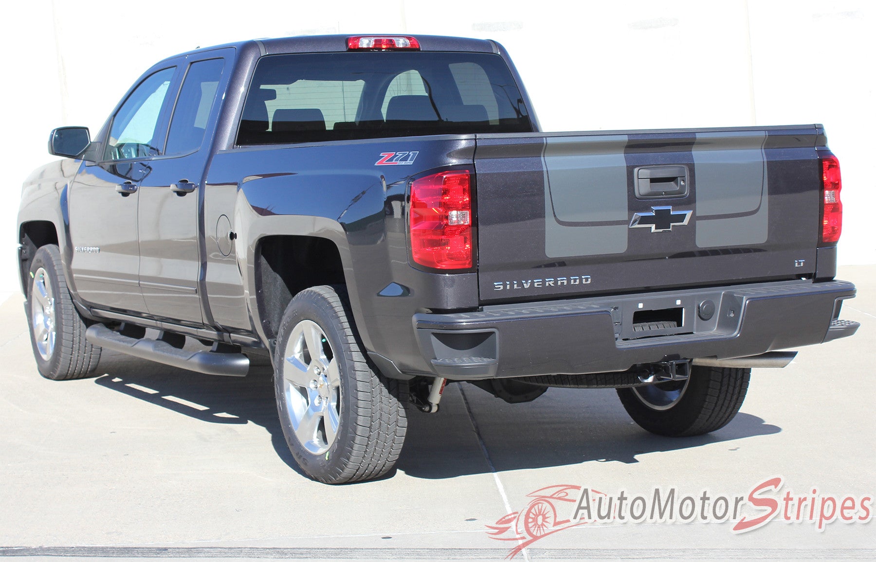2016 Chevy Silverado 1500 Chase Rally Edition Style Truck Hood Racing Vinyl Graphics - Tailgate View Charcoal Metallic on Dark Charcoal Paint