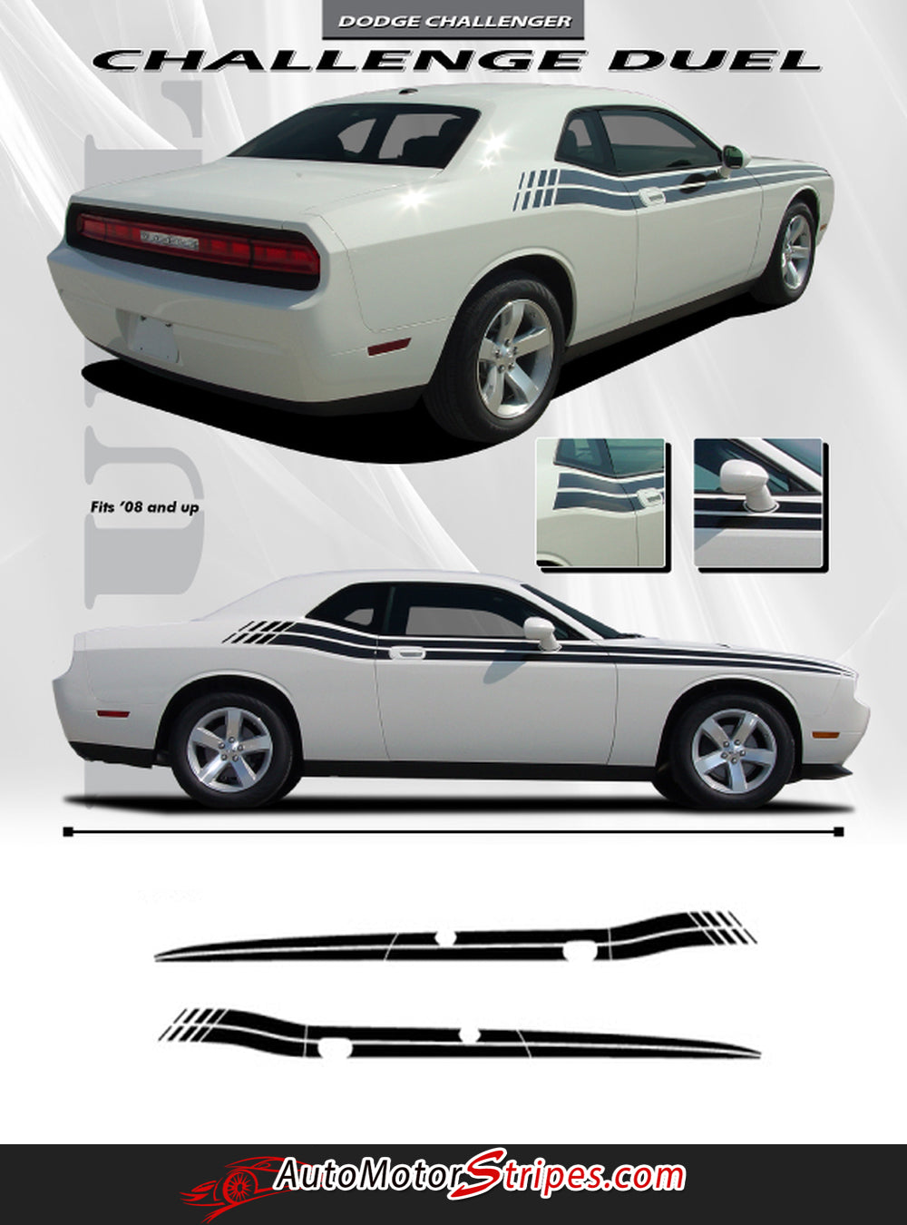 • DUEL vinyl striping package, brand new from AutoMotorStripes!  Another modern classic vinyl design can now be yours! Become the talk of the town by adding these best fitting classic R/T side accent stripe, with a thicker upper body which tapers down to the slim front accent stripe graphic! This side vinyl graphic style based on the OEM factory graphic kits is an accent decal and quickly becoming one of our best selling stripe kits for the current generation of vinyl decal kits for the new Dodge Challenger! This vinyl stripe kit has been specially and painstakingly precision measured and designed to fit the 2008 2009 2010 2011 2012 2013 2014 2015 2016 2017 2018 2019 2020 2021 2022 2023 Dodge Challenger. See precise fitment for the exact model/year mentioned above. Please also choose the correct options for your particular Dodge Challenger model stripe kit from those in the menu above. The vinyl graphic decal sections included with this vehicle specific vinyl stripe kit are driver and passenger side door striping. You can choose the options needed from the menu before adding to your cart, including the premium cast vinyl grade needed. Add this classic designed exterior accessory to the Dodge Challenger model for a modern 21st century look and feel! You will wonder why you let your Challenger go so long without these vinyl graphics! Add durability and weather resistance with these vinyl stripes, and add many years of enjoyment for a more custom factory style!