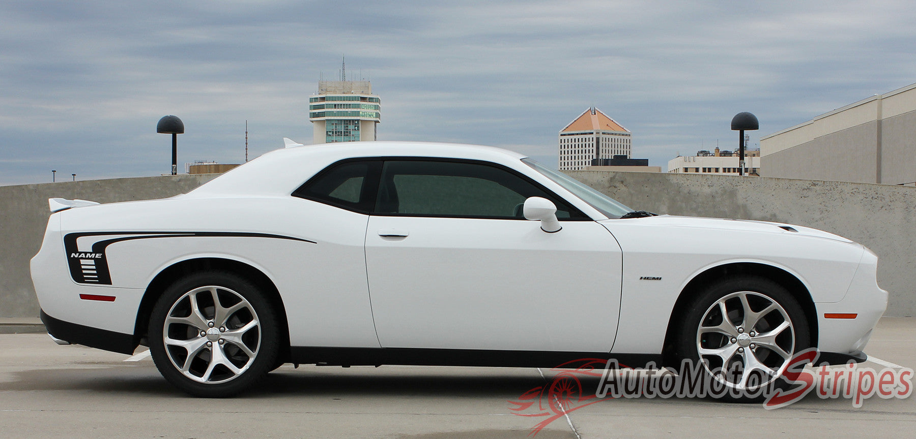 • CUDA SIDE STROBE vinyl striping package, brand new from AutoMotorStripes!  You gonna burn, burn, burn to the wick, Barracuda! Get inspired with a cuda style rear strobe vinyl design! Add these best fitting rear quarter fender accent stripes, with custom text available. This side vinyl graphic style based on the OEM factory graphic kits is an accent striping package and quickly becoming one of our best selling stripe kits for the current generation of vinyl decal kits for the new Dodge Challenger! This vinyl stripe kit has been specially and painstakingly precision measured and designed to fit the 2008 2009 2010 2011 2012 2013 2014 2015 2016 2017 2018 2019 2020 2021 2022 2023 Dodge Challenger. See precise fitment for the exact model/year mentioned above. Please also choose the correct options for your particular Dodge Challenger model stripe kit from those in the menu above. The vinyl graphic decal sections included with this vehicle specific vinyl stripe kit are driver and passenger side rear striping. You can choose the options needed from the menu before adding to your cart, including the premium cast vinyl grade needed. Add this classic designed exterior accessory to the Dodge Challenger model for a modern 21st century look and feel! You will wonder why you let your Challenger go so long without these vinyl graphics! Add durability and weather resistance with these vinyl stripes, and add many years of enjoyment for a more custom factory style!