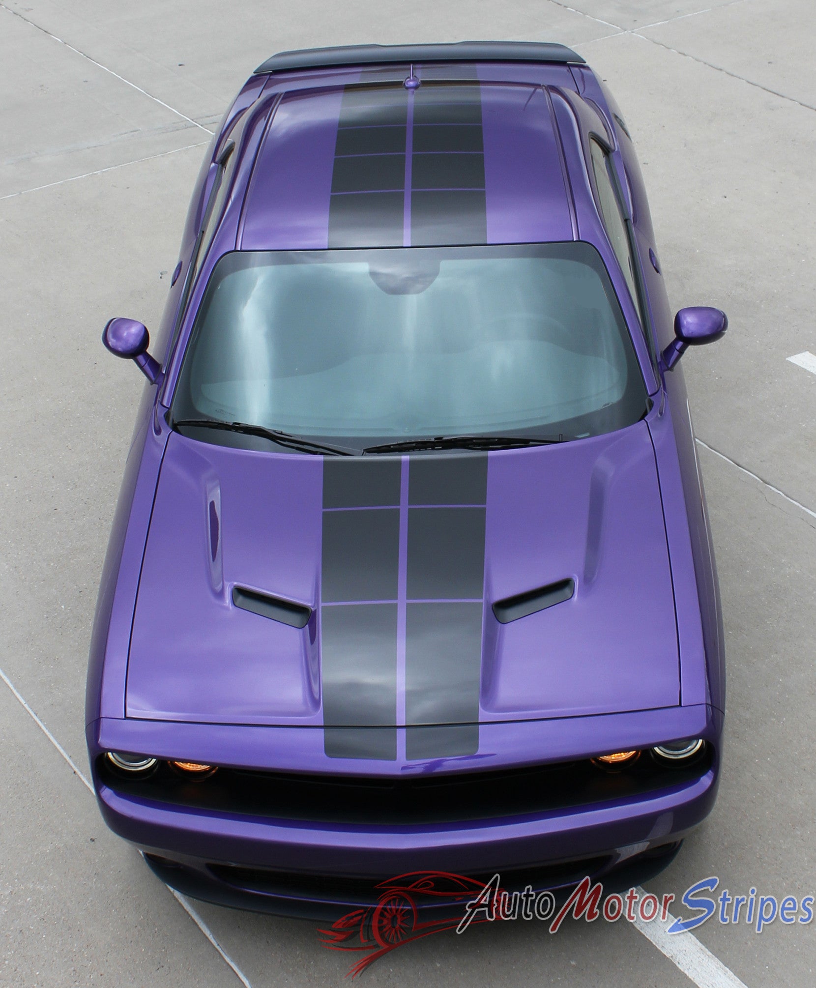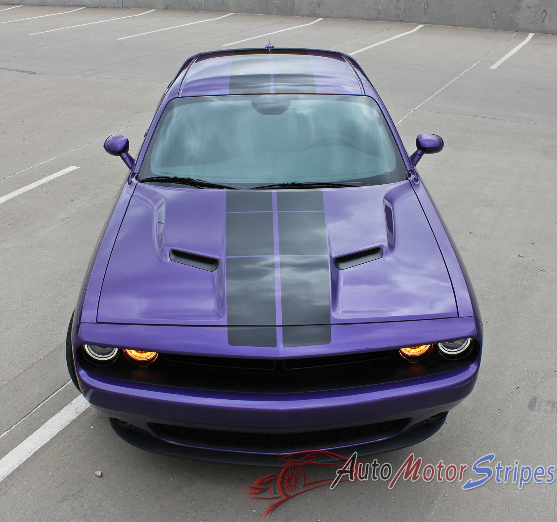 • CHALLENGER PULSE RALLY vinyl striping package, brand new from AutoMotorStripes!  If you have been looking for the best fitting racing stripes available, look no further! The dual strobe rally style vinyl graphic hood striping is quickly becoming a best seller among our Challenger stripe kits for the current generation of vinyl decal kits for the new Dodge Challenger models! This vinyl stripe kit has been specially and painstakingly precision measured and designed to fit the 2008 2009 2010 2011 2012 2013 2014 2015 2016 2017 2018 2019 2020 2021 2022 2023 Dodge Challenger. See precise fitment for the exact model/year mentioned above. Please also choose the correct options for your particular Dodge Challenger model stripe kit from those in the menu above. The vinyl graphic decal sections included with this vehicle specific vinyl stripe kit are hood graphics, roof decals, trunk decal sections. You can choose the options needed from the menu before adding to your cart, including the premium cast vinyl grade needed. Add this classic designed exterior accessory to the Dodge Challenger model for a modern 21st century look and feel! You will wonder why you let your Challenger go so long without these vinyl graphics! Add durability and weather resistance with these vinyl stripes, and add many years of enjoyment for a more custom factory style!
