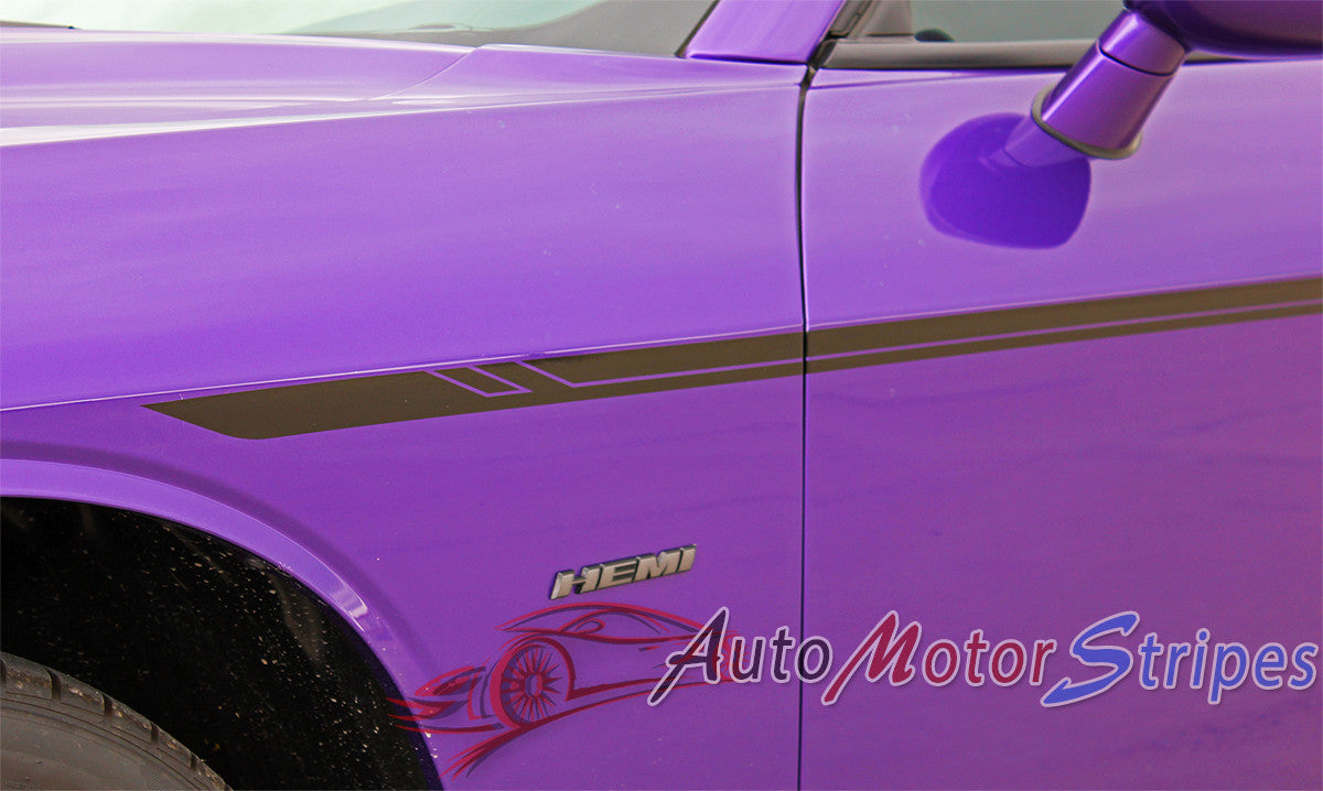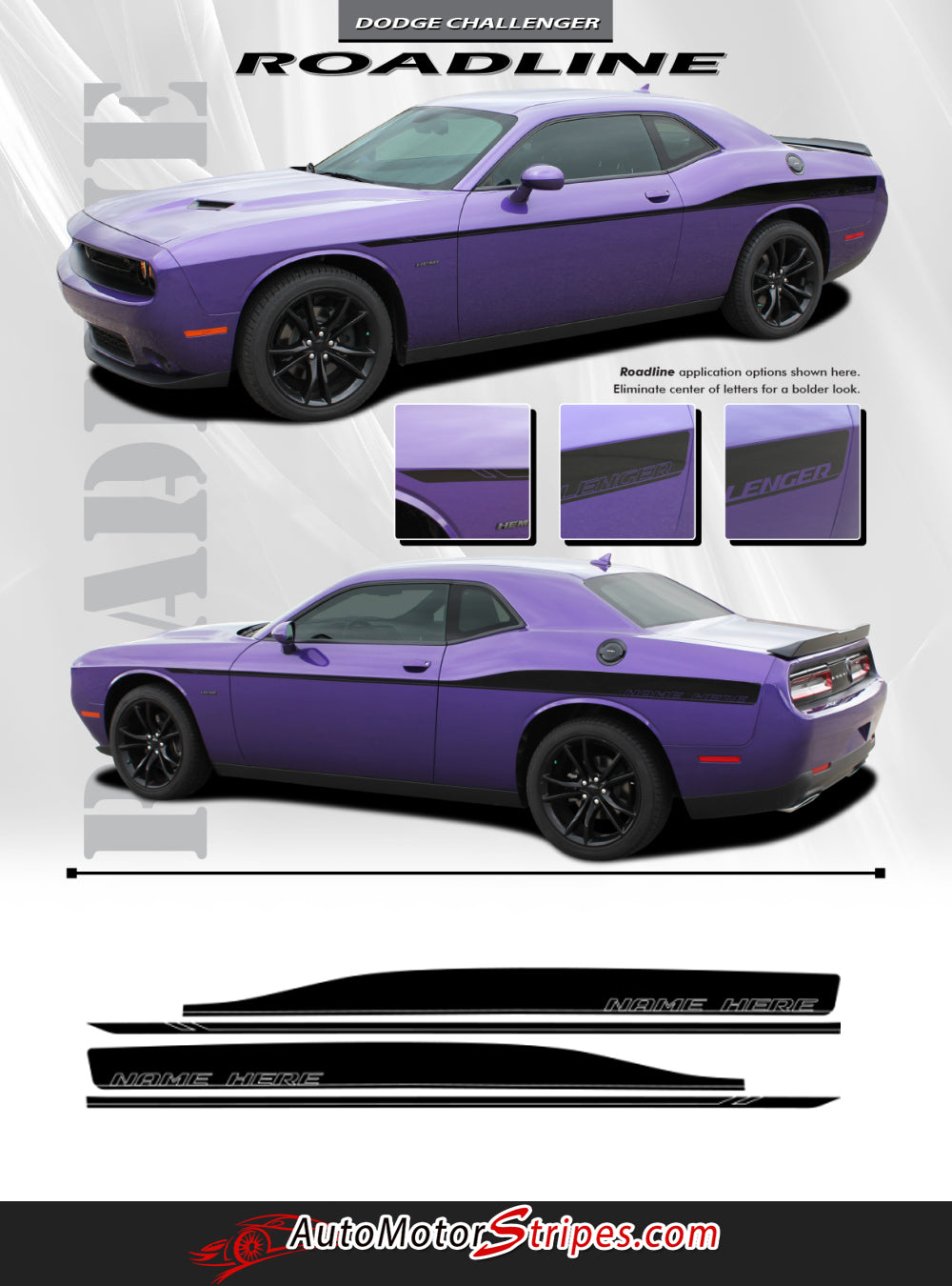 • ROADLINE vinyl striping package, brand new from AutoMotorStripes!  If you are looking for a subtle and exciting design, then take a look at this! You will turn some heads with a modern vinyl design by adding this best fitting mid-body accent stripe, with a thin profile running the length of the door and widening at the fenders. This side vinyl graphic style based on the OEM factory graphic kits is an accent decal and quickly becoming one of our best selling stripe kits for the current generation of vinyl decal kits for the new Dodge Challenger! This vinyl stripe kit has been specially and painstakingly precision measured and designed to fit the 2008 2009 2010 2011 2012 2013 2014 2015 2016 2017 2018 2019 2020 2021 2022 2023 Dodge Challenger. See precise fitment for the exact model/year mentioned above. Please also choose the correct options for your particular Dodge Challenger model stripe kit from those in the menu above. The vinyl graphic decal sections included with this vehicle specific vinyl stripe kit are driver and passenger side striping. You can choose the options needed from the menu before adding to your cart, including the premium cast vinyl grade needed. Add this classic designed exterior accessory to the Dodge Challenger model for a modern 21st century look and feel! You will wonder why you let your Challenger go so long without these vinyl graphics! Add durability and weather resistance with these vinyl stripes, and add many years of enjoyment for a more custom factory style!