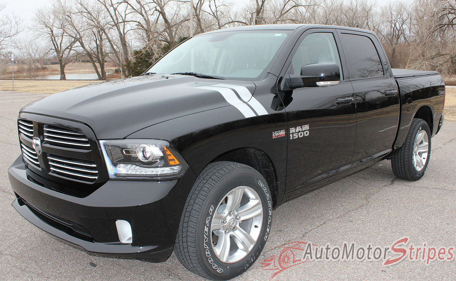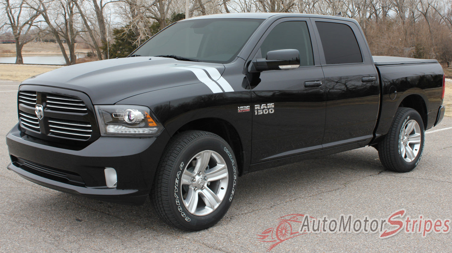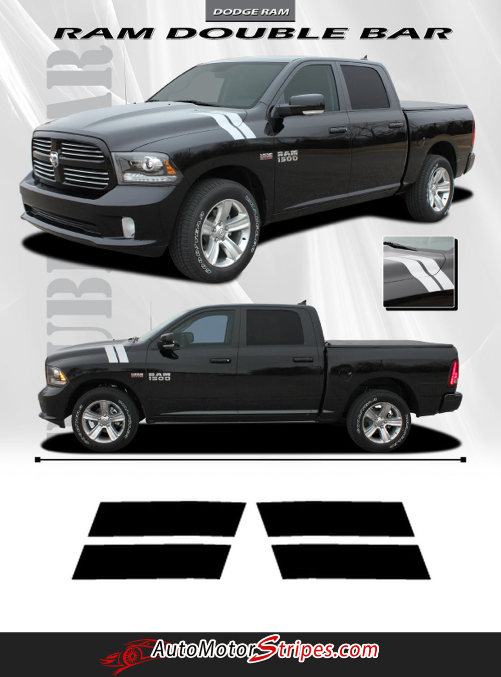 • RAM DOUBLE BAR vinyl striping package, brand new from AutoMotorStripes!  Want to drive the biggest, baddest truck in town? Then get noticed with this hood to fender double hash mark vinyl graphic design! This vinyl striping design has a mean custom factory OE graphic decal style, and this modern accent striping package and has quickly become a very popular selling stripe package for the current generation of vinyl graphic kits for the new Dodge Ram! Much time, effort and patience has gone into properly measuring this vinyl graphic style for precision fitment, and designed to fit the 2009 2010 2011 2012 2013 2014 2015 2016 2017 2018 Dodge RAM 1500 and HEMI Models. See precise fitment for the exact model/year mentioned above. Please remember to also choose the correct vinyl options for your particular Dodge Ram Truck model stripe kit from those in the menu shown above. The vinyl decal sections sections included with this vehicle specific vinyl graphic kit are hood graphic, driver and passenger side graphic decals. You can now choose the options needed from the menu before adding to your cart, including the premium cast vinyl grade needed. This design is based on a classic, and is an exterior accessory for the Dodge Ram Truck model and gives it a very modern day upgrade! Don't let your Ram go another minute without these stylish vinyl graphics! You will receive many years of enjoyment with this weather resistant and durable custom factory vinyl style!