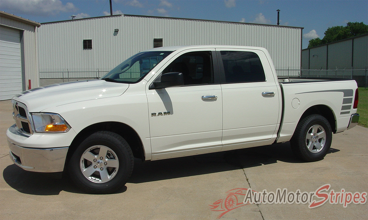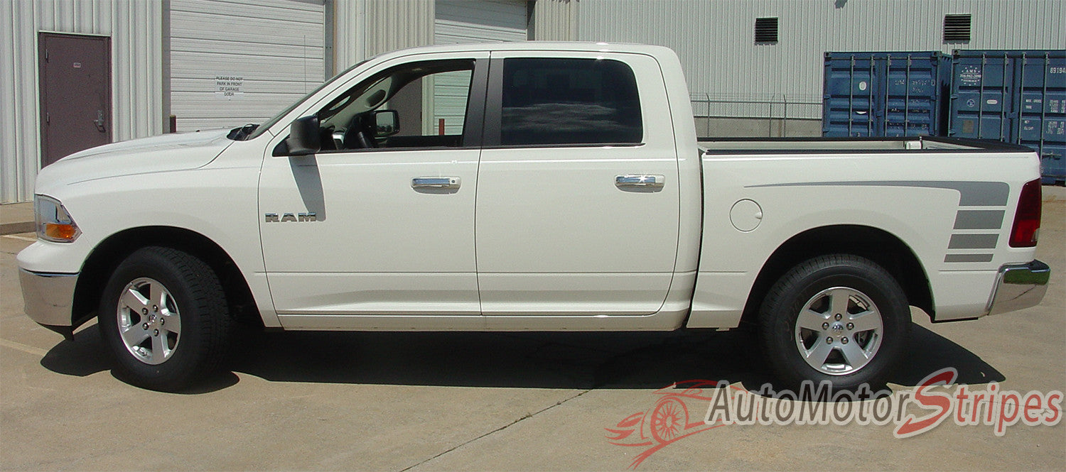 2009-2016 Dodge Ram Power Truck Hood and Rear Side Strobes Truck Bed Vinyl Graphic - Silver Metallic on White Side Driver View