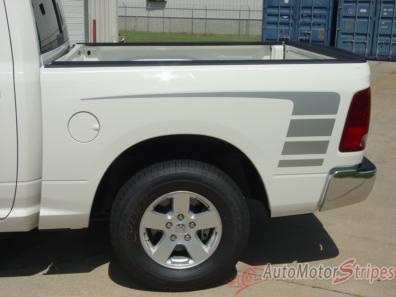 2009-2016 Dodge Ram Power Truck Hood and Rear Side Strobes Truck Bed Vinyl Graphic - Silver Metallic on White Rear Bed Driver View