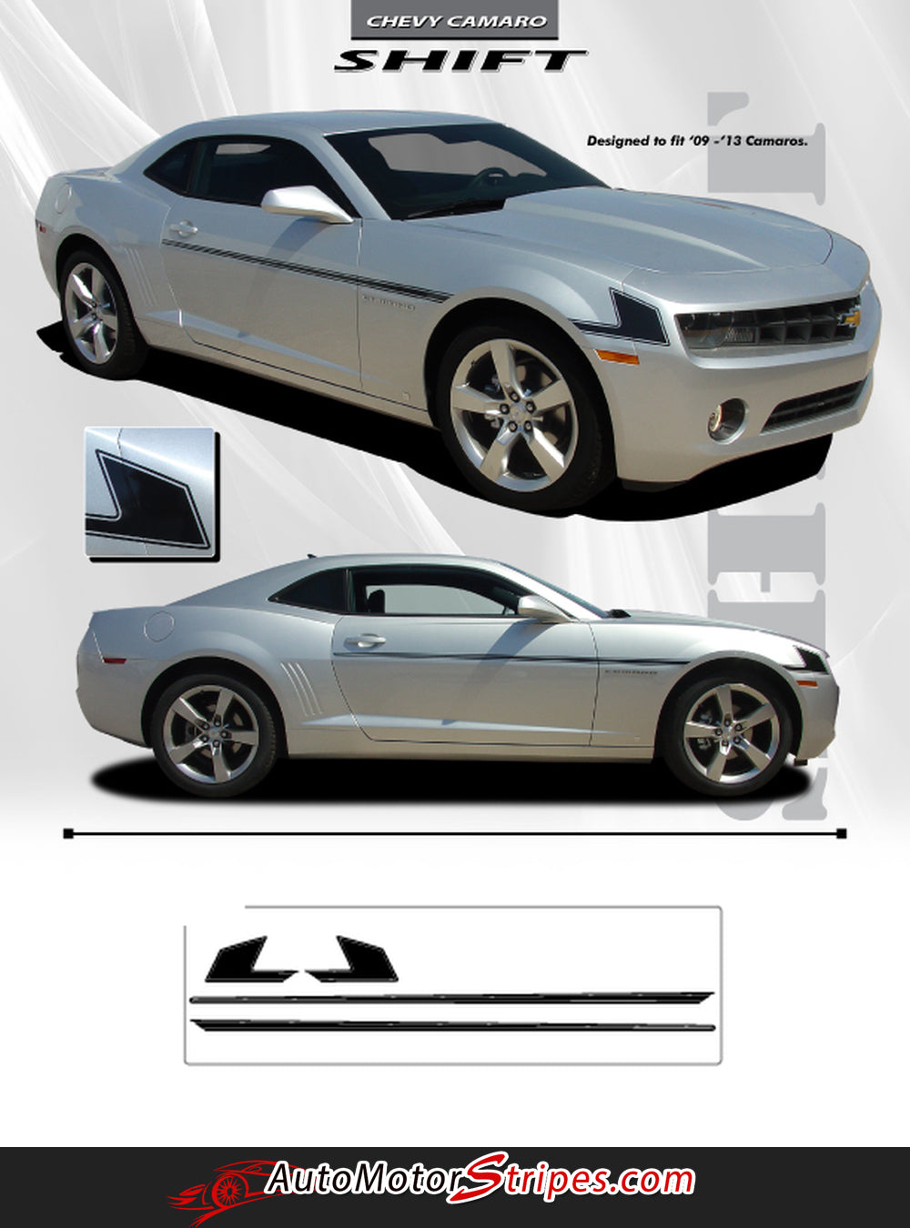 • SHIFT vinyl graphics package, brand new from AutoMotorStripes!  For those of us wanting a simple style that stands out in the crowded field of Camaro vinyl graphics, you have found that decal style! Featuring a popular hockey stick style, and specially made to fit the 2010-2013 or 2014-2015 Chevy Camaro SS, RS, V6 Coupe or Convertible Models and fits the model year mentioned above. Remember to choose the correct options for your particular Chevy Camaro. The decal sections included with this vehicle specific vinyl graphic are driver and passenger side striping. Just choose the options needed from the drop down menu, including the premium cast vinyl grade. Add this needed exterior accessory to the new Camaro models for a real muscle car look and feel! Durable weather resistant vinyl will add years of enjoyment for a more custom factory style!