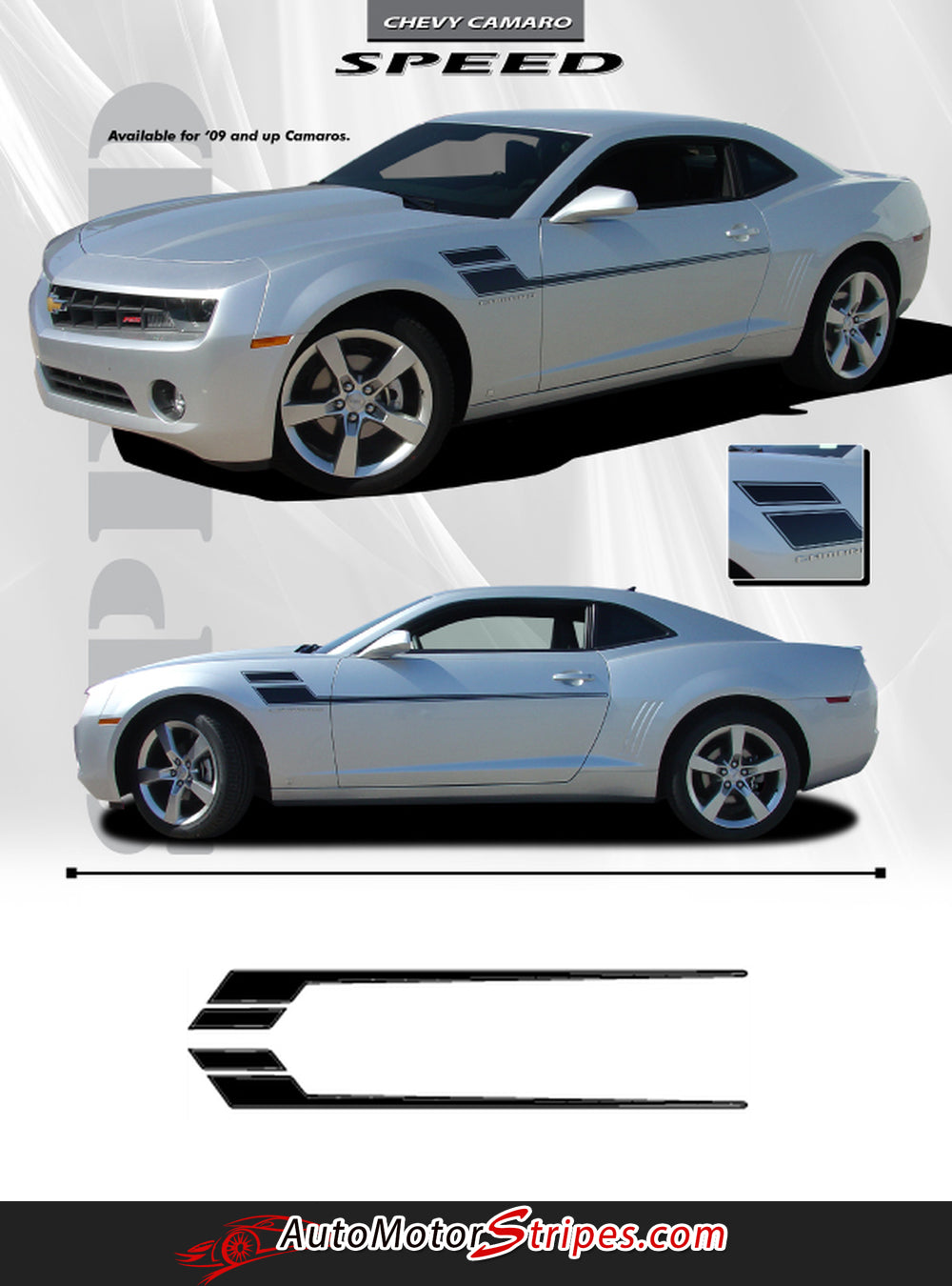 • SPEED vinyl graphics package, brand new from AutoMotorStripes!  For those of us wanting a simple style that stands out in the crowded field of Camaro vinyl graphics, you have found that decal style! Featuring a popular hockey stick style, and specially made to fit the 2010-2013 or 2014-2015 Chevy Camaro SS, RS, V6 Coupe or Convertible Models and fits the model year mentioned above. Remember to choose the correct options for your particular Chevy Camaro. The decal sections included with this vehicle specific vinyl graphic are driver and passenger side striping. Just choose the options needed from the drop down menu, including the premium cast vinyl grade. Add this needed exterior accessory to the new Camaro models for a real muscle car look and feel! Durable weather resistant vinyl will add years of enjoyment for a more custom factory style!