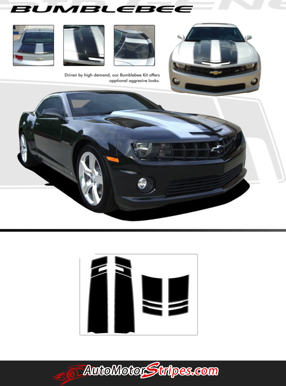 • BUMBLEBEE vinyl graphics package, brand new from AutoMotorStripes!  Quickly becoming a classic design for this generation of Camaro, you are viewing a factory style center set rally stripe that fits the 2010-2015 Chevy Camaro SS RS All V6 when the correct option and model year is chosen as mentioned above. The decal sections included with this vehicle specific vinyl graphic are driver and passenger hood stripes, trunk striping and rear spoiler stripe sections. Just choose the options needed from the drop down menu, including the premium cast vinyl grade. Add this needed exterior accessory to the new Camaro models for a real muscle car look and feel! Durable weather resistant vinyl will add years of enjoyment for a more custom factory style!