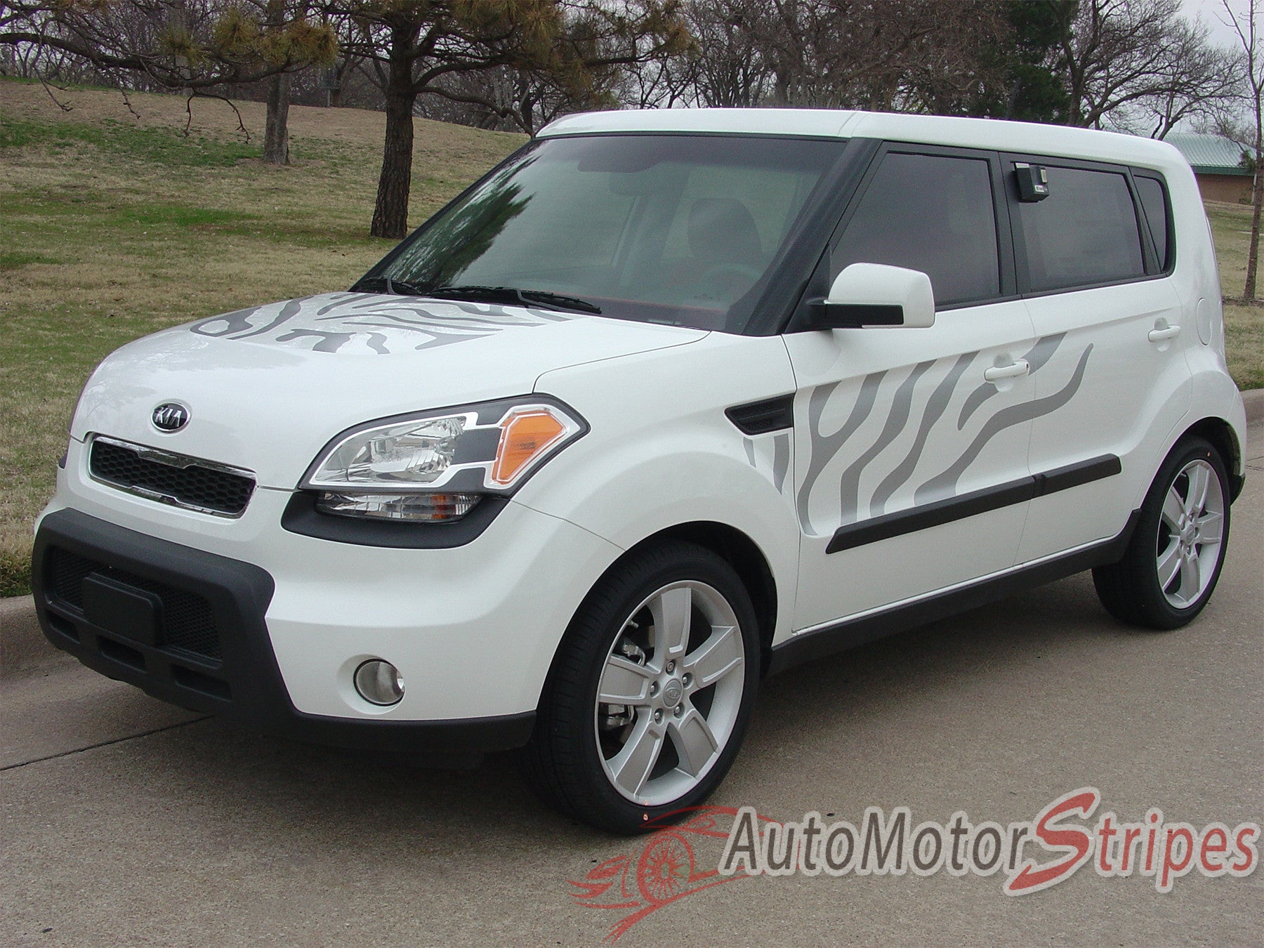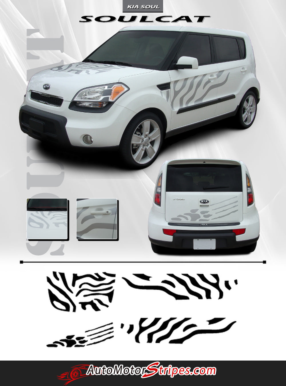 • Kia Soul SOUL CAT vinyl graphic and striping packages, brand new from AutoMotorStripes!  The new Kia Soul is here! This Soul Cat Hood Rear Jungle Animal Factory Style Side Rear trim package vinyl graphic design will add style and class to your Kia Soul! This vinyl striping graphic design has just what this Kia model needs, an upgraded custom factory OE graphic decal style, and is a very popular accent striping package for our local Kia auto dealers. These cars need a popular selling vinyl stripe package to help auto dealers sell the current generation of Kia! You will purchase quality vinyl, because much time, effort and skill has gone into patiently and properly measuring this vinyl graphic style for precision fitment, and designed to fit the 2010 2011 2012 2013 Kia Soul. Please see precise fitment for the exact model/year mentioned above. Please remember to also choose the correct vinyl decal options for your particular model from those in the menu shown above. The vinyl decal sections sections included with this vehicle specific vinyl graphic kit are HOOD, REAR, DRIVER and PASSENGER side graphic decals. You can now choose the options needed from the menu before adding to your cart, including the premium cast vinyl grade needed. This design is based on a classic, and is an exterior accessory for the Kia Soul model and gives it a very modern day upgrade! Don't let your Kia go another day without these stylish vinyl graphics! You will receive many years of enjoyment with this weather resistant and durable custom factory vinyl style!