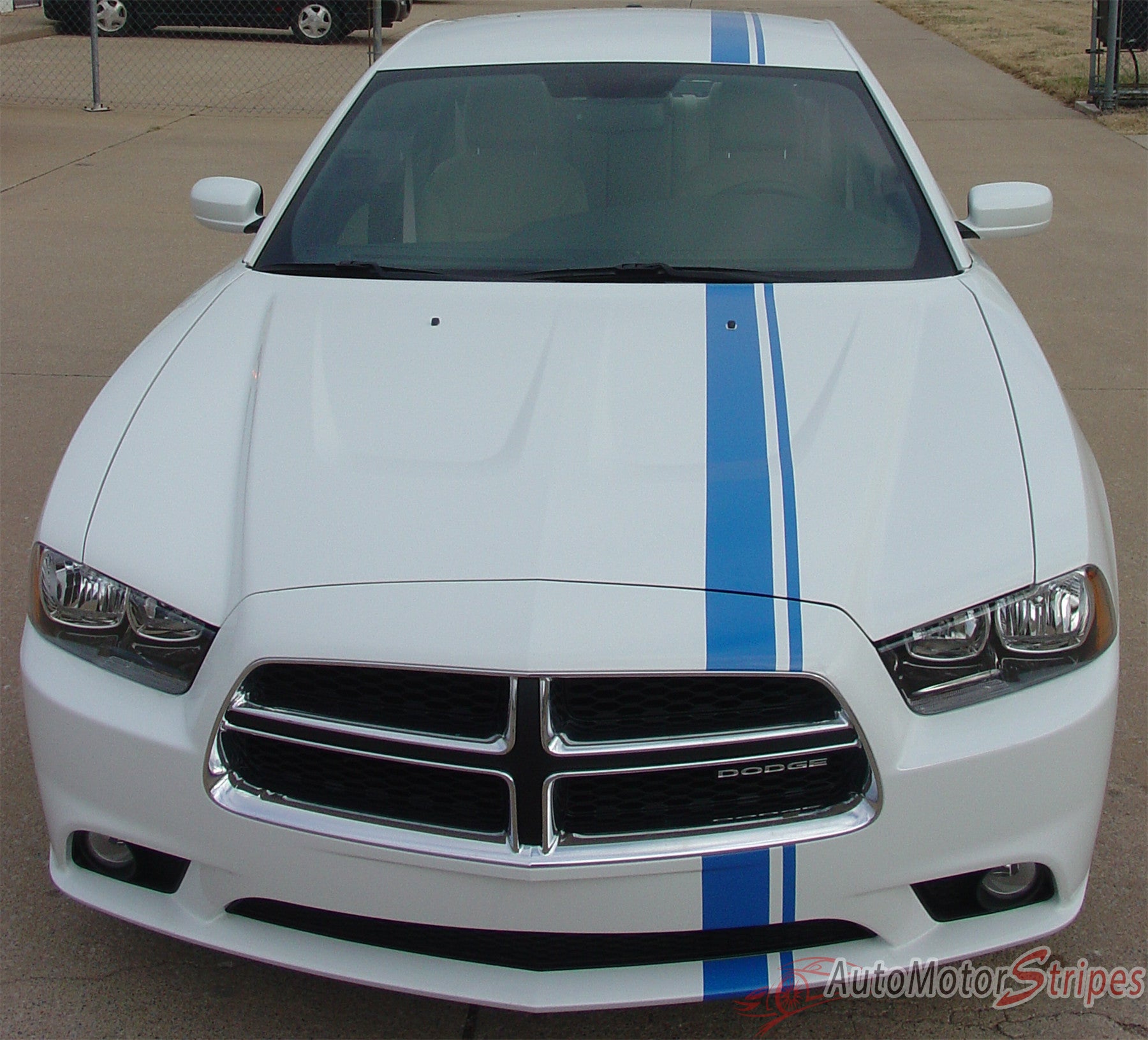 2011-2014 Dodge Charger E-Rally Mopar Style Offset Euro Rally Vinyl Graphic Racing Stripes - Front Hood View Blue Stripes on White