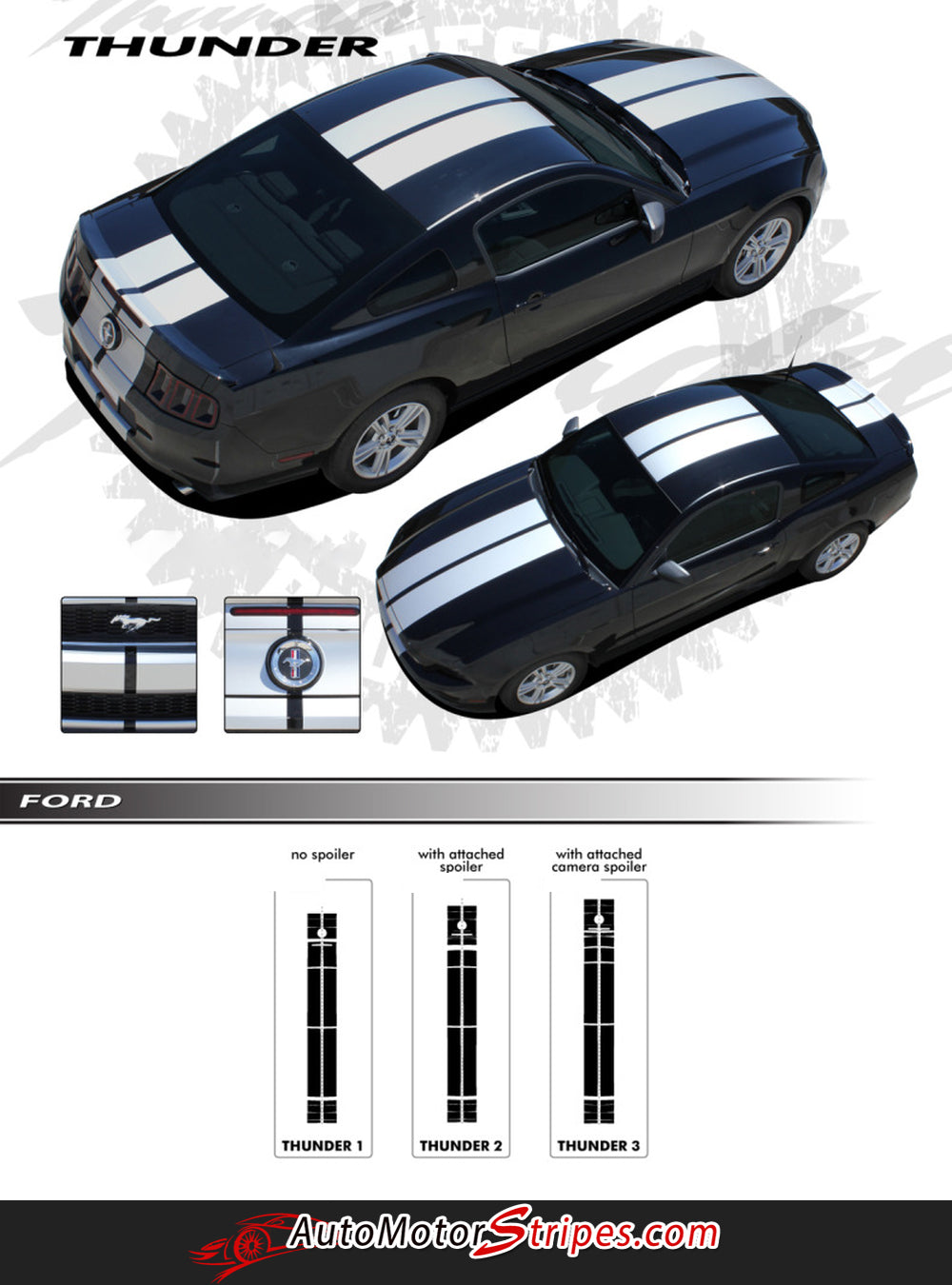 • THUNDER vinyl graphics package, brand new from AutoMotorStripes!  Days of Future Past! This is an OEM factory inspired lemans style 10" inch racing rally style stripe kit for the Mustang, and specially precision designed to fit the 2013 2014 Ford Mustang and fits the model year mentioned above. Remember to choose the correct options for your particular Ford Mustang stripe kit. The decal sections included with this vehicle specific vinyl graphic are bumpers, hood graphic, roof stripes, rear trunk decals, and spoiler stripes. Just choose the options needed from the drop down menu, including the premium cast vinyl grade. Add this needed exterior accessory to the these Mustang models for a real muscle car look and feel, the Mustang just looks plain without these vinyl graphics! Durable weather resistant vinyl will add years of enjoyment for a more custom factory style!