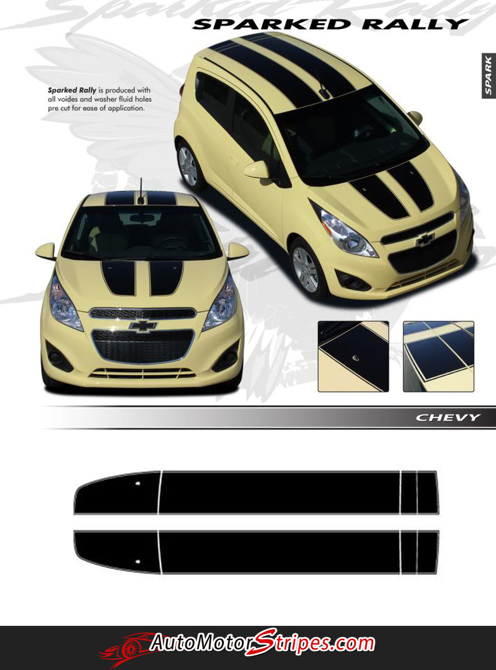 • Chevy Spark RALLY vinyl graphic and striping packages, brand new from AutoMotorStripes!  Want to turn a plain Jane into a fancy Nancy? Add this cool racing stripe trim package vinyl graphic design! This vinyl striping graphic design has just what this Chevy model needs, an upgraded custom factory OE graphic decal style, and is a very popular accent striping package for our local Chevy auto dealers. These plain cars need a popular selling vinyl stripe package to help these dealers sell the current generation of Chevy passenger car! You will purchase quality vinyl, because much time, effort and skill has gone into patiently and properly measuring this vinyl graphic style for precision fitment, and designed to fit the 2013 2014 2015 2016 Chevy Spark. Please see precise fitment for the exact model/year mentioned above. Please remember to also choose the correct vinyl decal options for your particular model from those in the menu shown above. The vinyl decal sections sections included with this vehicle specific vinyl graphic kit are hood graphic, roof graphics, and rear hatch graphic decals. You can now choose the options needed from the menu before adding to your cart, including the premium cast vinyl grade needed. This design is based on a classic, and is an exterior accessory for the Chevrolet Spark model and gives it a very modern day upgrade! Don't let your Chevy Spark go another day without these stylish vinyl graphics! You will receive many years of enjoyment with this weather resistant and durable custom factory vinyl style!