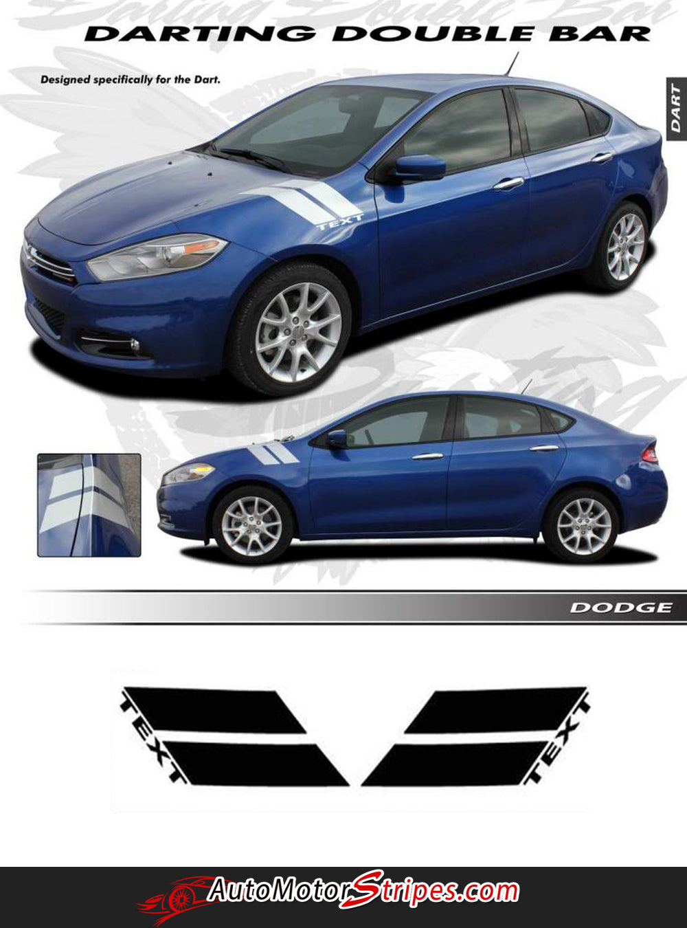 • Dodge Dart DOUBLE BAR vinyl graphic and striping packages, brand new from AutoMotorStripes!  From the past comes a name you remember, the new generation of Dodge Dart is here! This double bar hash mark hood to fender trim package vinyl graphic design will add style to your Dart! This vinyl striping graphic design has just what this Dodge model needs, an upgraded custom factory OE graphic decal style, and is a very popular accent striping package for our local Dodge auto dealers. These plain cars need a popular selling vinyl stripe package to help these dealers sell the current generation of Dodge passenger car! You will purchase quality vinyl, because much time, effort and skill has gone into patiently and properly measuring this vinyl graphic style for precision fitment, and designed to fit the 2013 2014 2015 2016 Dodge Dart. Please see precise fitment for the exact model/year mentioned above. Please remember to also choose the correct vinyl decal options for your particular model from those in the menu shown above. The vinyl decal sections sections included with this vehicle specific vinyl graphic kit are DRIVER and PASSENGER hood graphic decals. You can now choose the options needed from the menu before adding to your cart, including the premium cast vinyl grade needed. This design is based on a classic, and is an exterior accessory for the Dodge Dart model and gives it a very modern day upgrade! Don't let your Dodge Dart go another day without these stylish vinyl graphics! You will receive many years of enjoyment with this weather resistant and durable custom factory vinyl style!