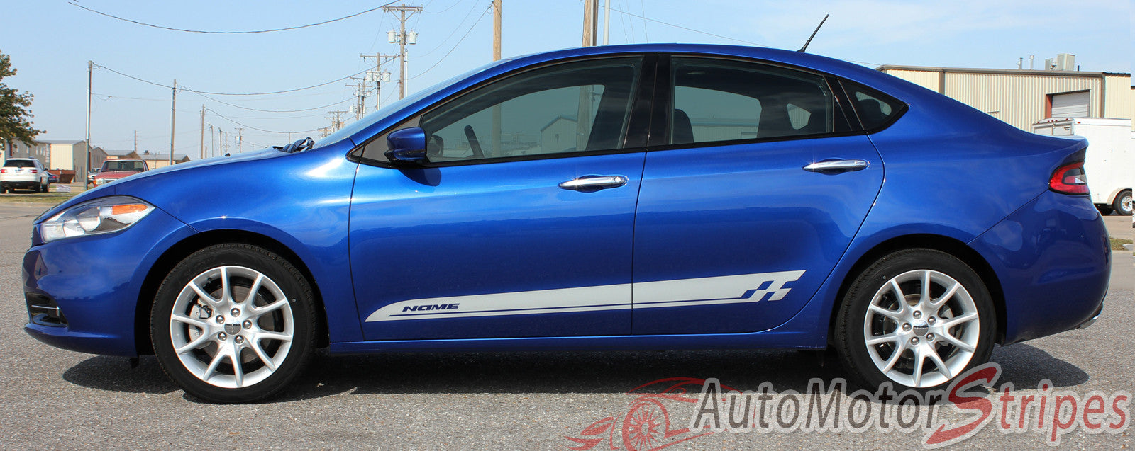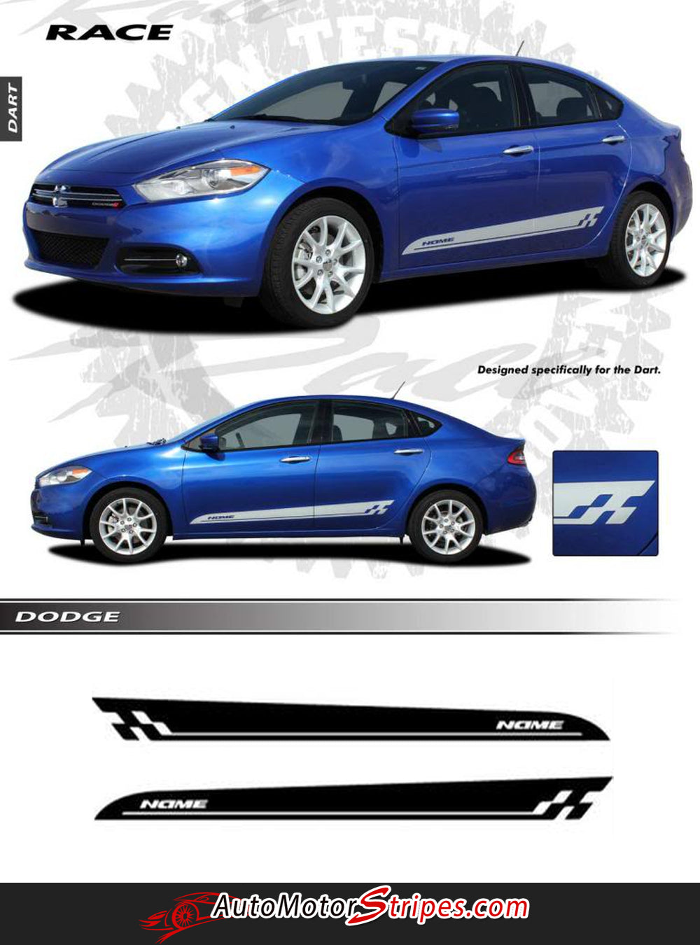 • Dodge Dart RACE vinyl graphic and striping packages, brand new from AutoMotorStripes!  From the past comes a name you remember, the new generation of Dodge Dart is here! This lower rocker panel door striping trim package vinyl graphic design will add style to your Dart! This vinyl striping graphic design has just what this Dodge model needs, an upgraded custom factory OE graphic decal style, and is a very popular accent striping package for our local Dodge auto dealers. These plain cars need a popular selling vinyl stripe package to help these dealers sell the current generation of Dodge passenger car! You will purchase quality vinyl, because much time, effort and skill has gone into patiently and properly measuring this vinyl graphic style for precision fitment, and designed to fit the 2013 2014 2015 2016 Dodge Dart. Please see precise fitment for the exact model/year mentioned above. Please remember to also choose the correct vinyl decal options for your particular model from those in the menu shown above. The vinyl decal sections sections included with this vehicle specific vinyl graphic kit are DRIVER and PASSENGER side graphic decals. You can now choose the options needed from the menu before adding to your cart, including the premium cast vinyl grade needed. This design is based on a classic, and is an exterior accessory for the Dodge Dart model and gives it a very modern day upgrade! Don't let your Dodge Dart go another day without these stylish vinyl graphics! You will receive many years of enjoyment with this weather resistant and durable custom factory vinyl style!