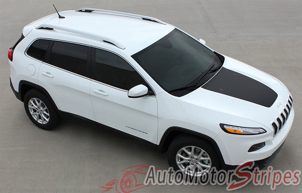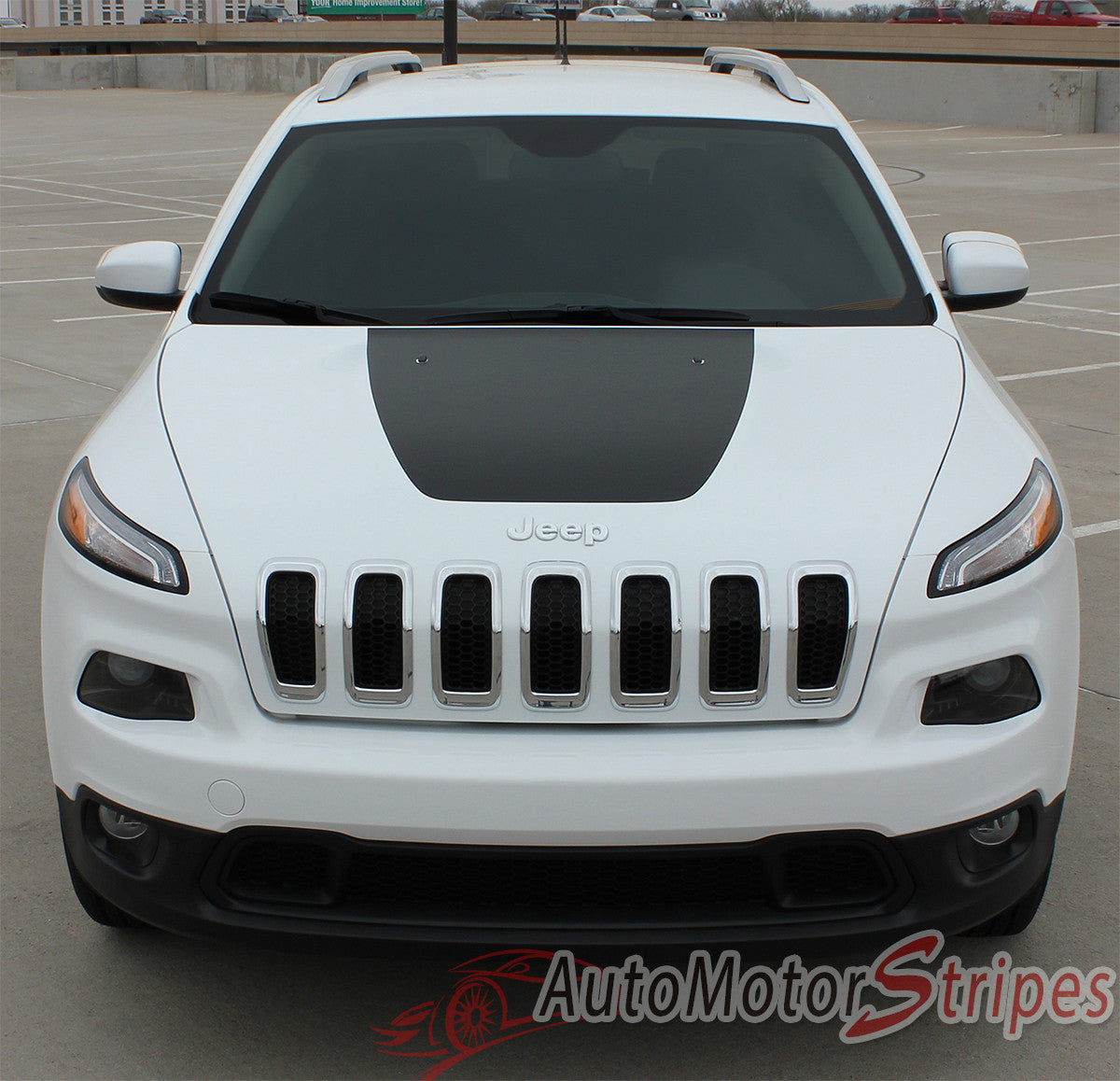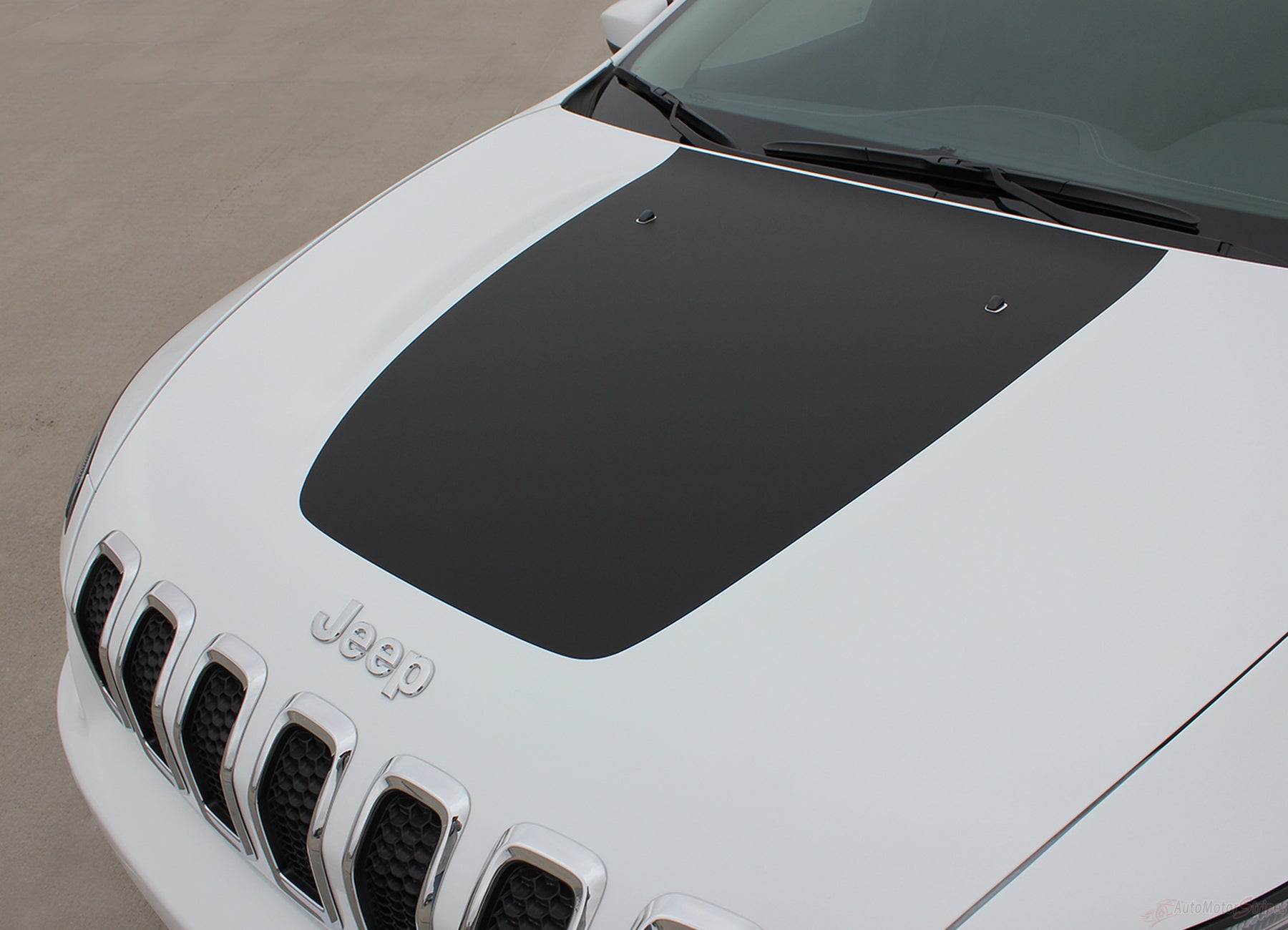 View of 2014-2024 Jeep Cherokee T-Hawk Factory OEM Trailhawk Style Center Hood Blackout Vinyl Decal Graphic Stripes