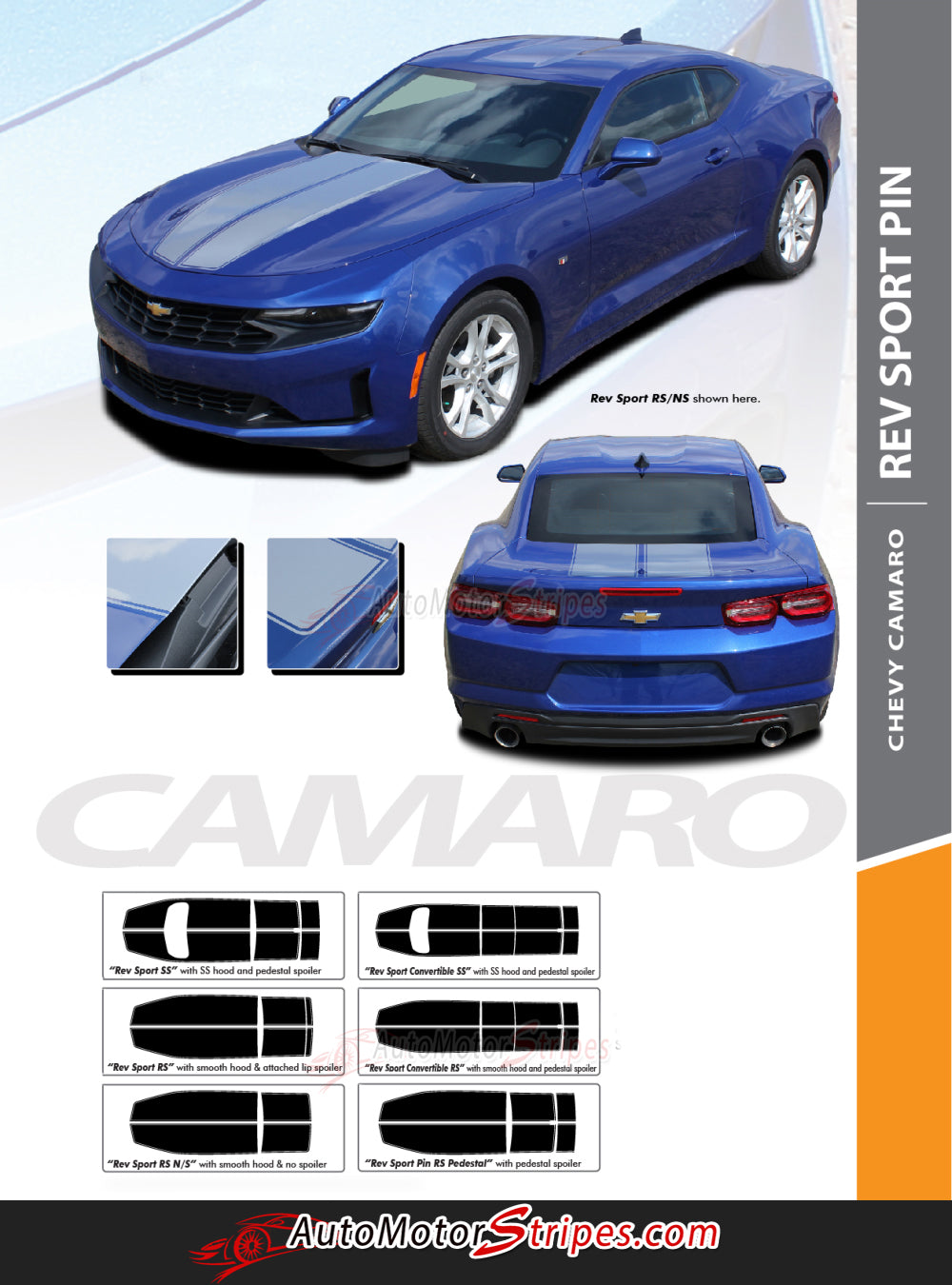 • REV SPORT with PIN OUTLINE vinyl graphics package, brand new from AutoMotorStripes!  This is a factory style racing stripe for an OEM style application for the 2019 2020 2021 2022 2023 2024 Chevy Camaro SS or RS Camaro and fits the model year mentioned above. The decal sections included with this vehicle specific vinyl graphic are dual center hood, trunk and spoiler stripes. Just choose the options needed from the drop down menu, including the premium cast vinyl grade. Add this needed exterior accessory to the new Camaro models for a real muscle car look and feel! Durable weather resistant vinyl will add years of enjoyment for a more custom factory style!