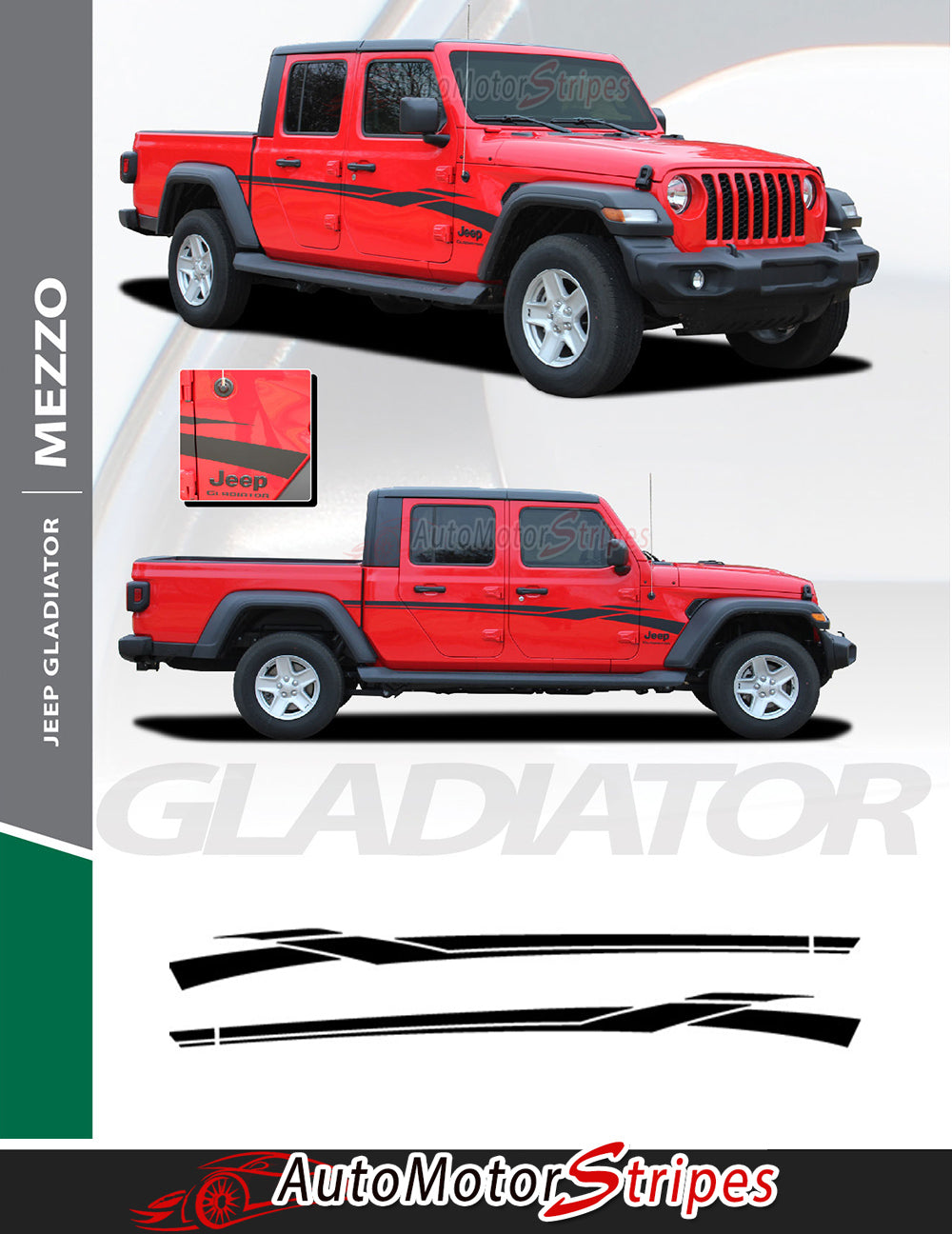 • Jeep Gladiator MEZZO SOLID COLOR SIDES vinyl graphic and striping packages, brand new from AutoMotorStripes!  The new Jeep Gladiator is here! This OEM Factory Style side body star trim package vinyl graphic design will add style and class to your Jeep Gladiator! This vinyl striping graphic design has just what this Jeep model needs, an upgraded custom factory OE graphic decal style, and is a very popular accent striping package for our local Jeep auto dealers. These cars need a popular selling vinyl stripe package to help auto dealers sell the current generation of Jeep! You will purchase quality vinyl, because much time, effort and skill has gone into patiently and properly measuring this vinyl graphic style for precision fitment, and designed to fit the 2020 2021 2022 2023 2024 2025 2026 Jeep Gladiator. Please see precise fitment for the exact model/year mentioned above. Please remember to also choose the correct vinyl decal options for your particular model from those in the menu shown above. The vinyl decal sections sections included with this vehicle specific vinyl graphic kit are driver and passenger vinyl graphic decals. You can now choose the options needed from the menu before adding to your cart, including the premium cast vinyl grade needed. This design is based on a classic, and is an exterior accessory for the Jeep Gladiator model and gives it a very modern day upgrade! Don't let your Jeep go another day without these stylish vinyl graphics! You will receive many years of enjoyment with this weather resistant and durable custom factory vinyl style!