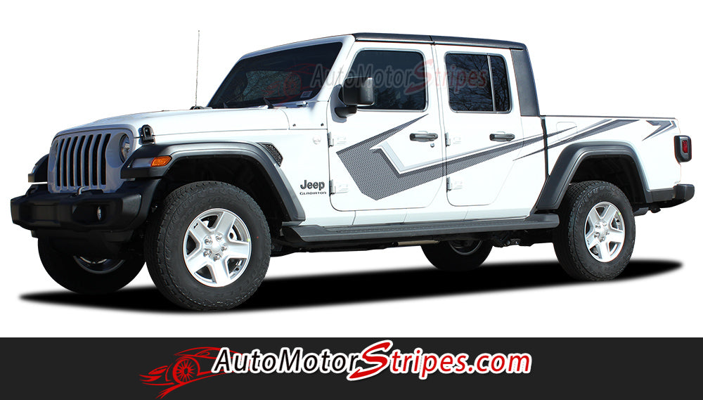 • Jeep Gladiator PARAMOUNT DIGITAL SIDES vinyl graphic and striping packages, brand new from AutoMotorStripes!  The new Jeep Gladiator is here! This OEM Factory Style side body star trim package vinyl graphic design will add style and class to your Jeep Gladiator! This vinyl striping graphic design has just what this Jeep model needs, an upgraded custom factory OE graphic decal style, and is a very popular accent striping package for our local Jeep auto dealers. These cars need a popular selling vinyl stripe package to help auto dealers sell the current generation of Jeep! You will purchase quality vinyl, because much time, effort and skill has gone into patiently and properly measuring this vinyl graphic style for precision fitment, and designed to fit the 2020 2021 2022 2023 2024 2025 2026 Jeep Gladiator. Please see precise fitment for the exact model/year mentioned above. Please remember to also choose the correct vinyl decal options for your particular model from those in the menu shown above. The vinyl decal sections sections included with this vehicle specific vinyl graphic kit are driver and passenger vinyl graphic decals. You can now choose the options needed from the menu before adding to your cart, including the premium cast vinyl grade needed. This design is based on a classic, and is an exterior accessory for the Jeep Gladiator model and gives it a very modern day upgrade! Don't let your Jeep go another day without these stylish vinyl graphics! You will receive many years of enjoyment with this weather resistant and durable custom factory vinyl style!