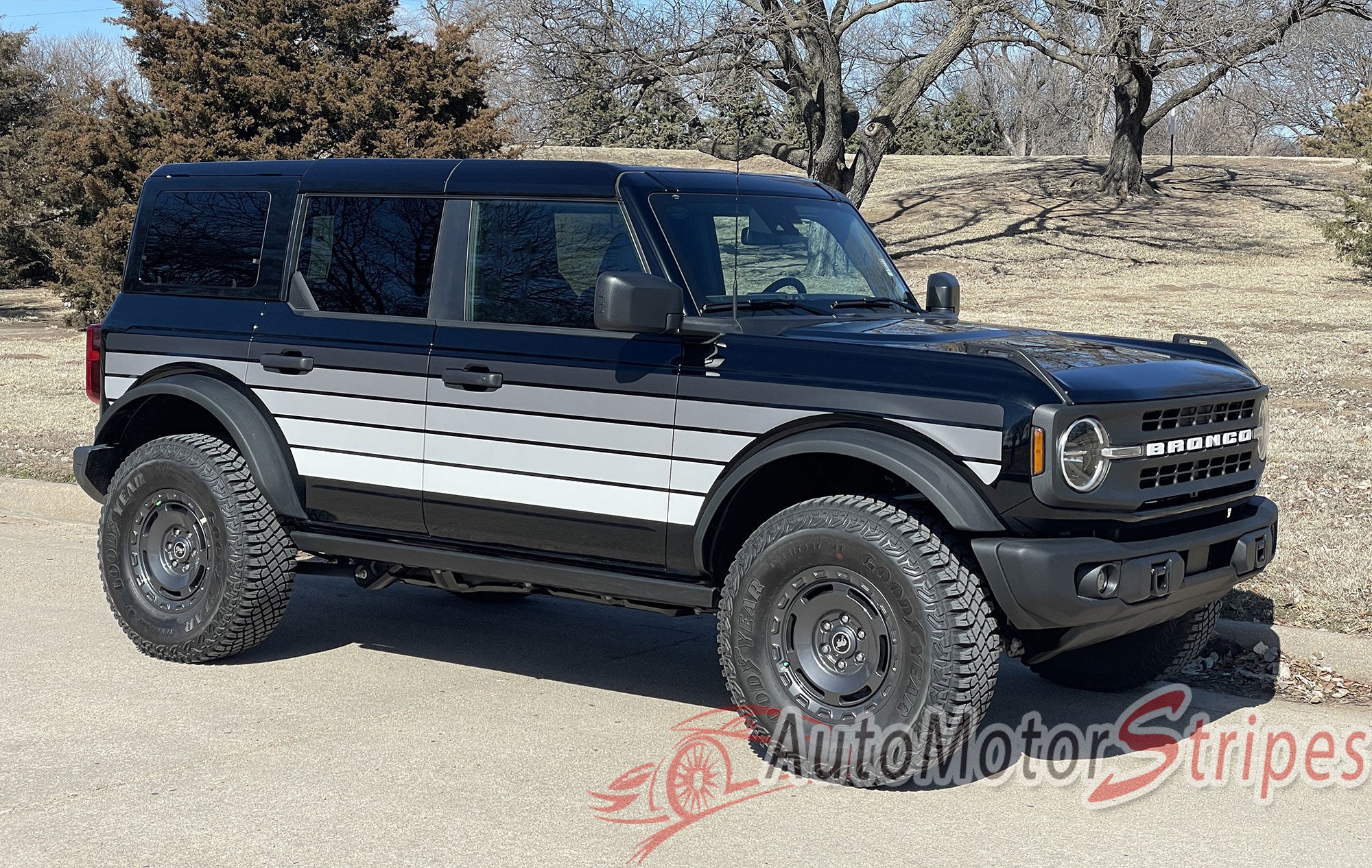 • Ford Bronco Full Size SUNSETTER XL vinyl graphic and striping packages, brand new from AutoMotorStripes!  A return to the modern mid-sized truck, the new Ford Bronco is ready for the off road! This side body door accent trim package vinyl graphic design will add style and class to your Ford Bronco! This vinyl striping graphic design has just what this Ford model needs, an upgraded custom factory OE graphic decal style, and is a very popular accent striping package for our local Ford auto dealers. These cars need a popular selling vinyl stripe package to help auto dealers sell the current generation of Ford mid-sized trucks! You will purchase quality vinyl because much time, effort and skill has gone into patiently and properly measuring this vinyl graphic style for precision fitment, and designed to fit the 2021, 2022, 2023, 2024, 2025, 2026 Ford Bronco. Please see precise fitment for the exact model/year mentioned above. Please remember to also choose the correct vinyl decal options for your particular model from those in the menu shown above. The vinyl decal sections sections included with this vehicle specific vinyl graphic kit are DRIVER and PASSENGER side graphic decals. You can now choose the options needed from the menu before adding to your cart, including the premium cast vinyl grade needed. This design is based on a classic, and is an exterior accessory for the Ford Bronco model and gives it a very modern day upgrade! Don't let your Ford go another day without these stylish vinyl graphics! You will receive many years of enjoyment with this weather resistant and durable custom factory vinyl style!