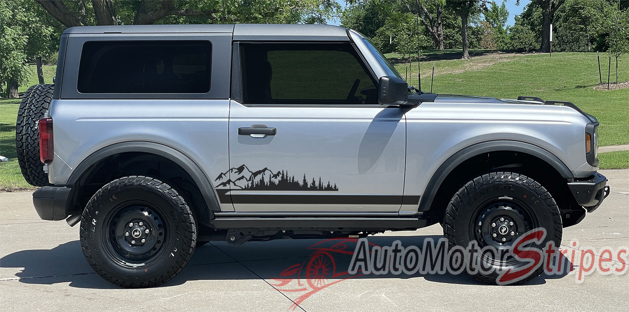 • Ford Bronco Full Size SERENE vinyl graphic and striping packages, brand new from AutoMotorStripes!  A return to the modern mid-sized truck, the new Ford Bronco is ready for the off road! This side body door accent trim package vinyl graphic design will add style and class to your Ford Bronco! This vinyl striping graphic design has just what this Ford model needs, an upgraded custom factory OE graphic decal style, and is a very popular accent striping package for our local Ford auto dealers. These cars need a popular selling vinyl stripe package to help auto dealers sell the current generation of Ford mid-sized trucks! You will purchase quality vinyl because much time, effort and skill has gone into patiently and properly measuring this vinyl graphic style for precision fitment, and designed to fit the 2021, 2022, 2023, 2024, 2025, 2026 Ford Bronco. Please see precise fitment for the exact model/year mentioned above. Please remember to also choose the correct vinyl decal options for your particular model from those in the menu shown above. The vinyl decal sections sections included with this vehicle specific vinyl graphic kit are DRIVER and PASSENGER side graphic decals. You can now choose the options needed from the menu before adding to your cart, including the premium cast vinyl grade needed. This design is based on a classic, and is an exterior accessory for the Ford Bronco model and gives it a very modern day upgrade! Don't let your Ford go another day without these stylish vinyl graphics! You will receive many years of enjoyment with this weather resistant and durable custom factory vinyl style!