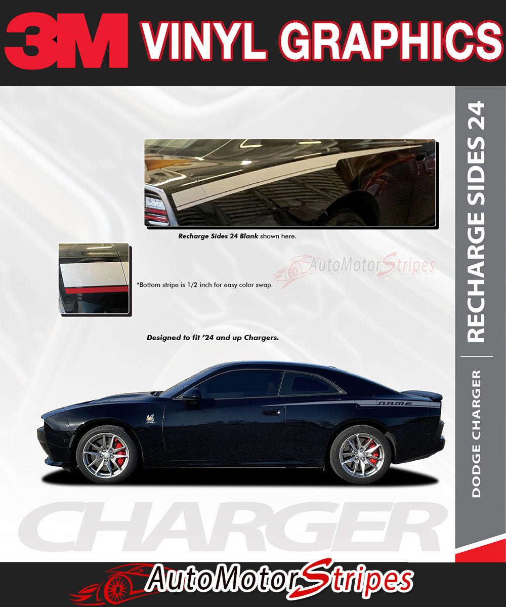 • DOUBLE BAR 24 HASH MARKS vinyl striping package, brand new from AutoMotorStripes!  This is the fast way to get noticed with this factory OE inspired hood double hash mark striping vinyl style! This vinyl graphic design is based on the custom factory graphic kit, and is an accent striping package that has quickly become a very popular selling striping kit for the current generation of vinyl graphics for the new Dodge Charger! This vinyl stripe kit has been specially and painstakingly measured for precision fitment and designed to fit the 2024 2025 Dodge Charger SE, SXT, R/T, Plus, Hellcat. See precise fitment for the exact model/year mentioned above. Please remember to also choose the correct vinyl options for your particular Dodge Charger model stripe kit from those in the menu shown above. The vinyl decal sections sections included with this vehicle specific vinyl graphic kit are hood driver and passenger graphic decals. You can now choose the options needed from the menu before adding to your cart, including the premium cast vinyl grade needed. This design is based on a classic, and is an exterior accessory for the Dodge Charger model and gives it a very modern day upgrade! Why did you let your Charger go so long without these vinyl graphics? You will receive many years of enjoyment with this weather resistant and durable custom factory vinyl style!