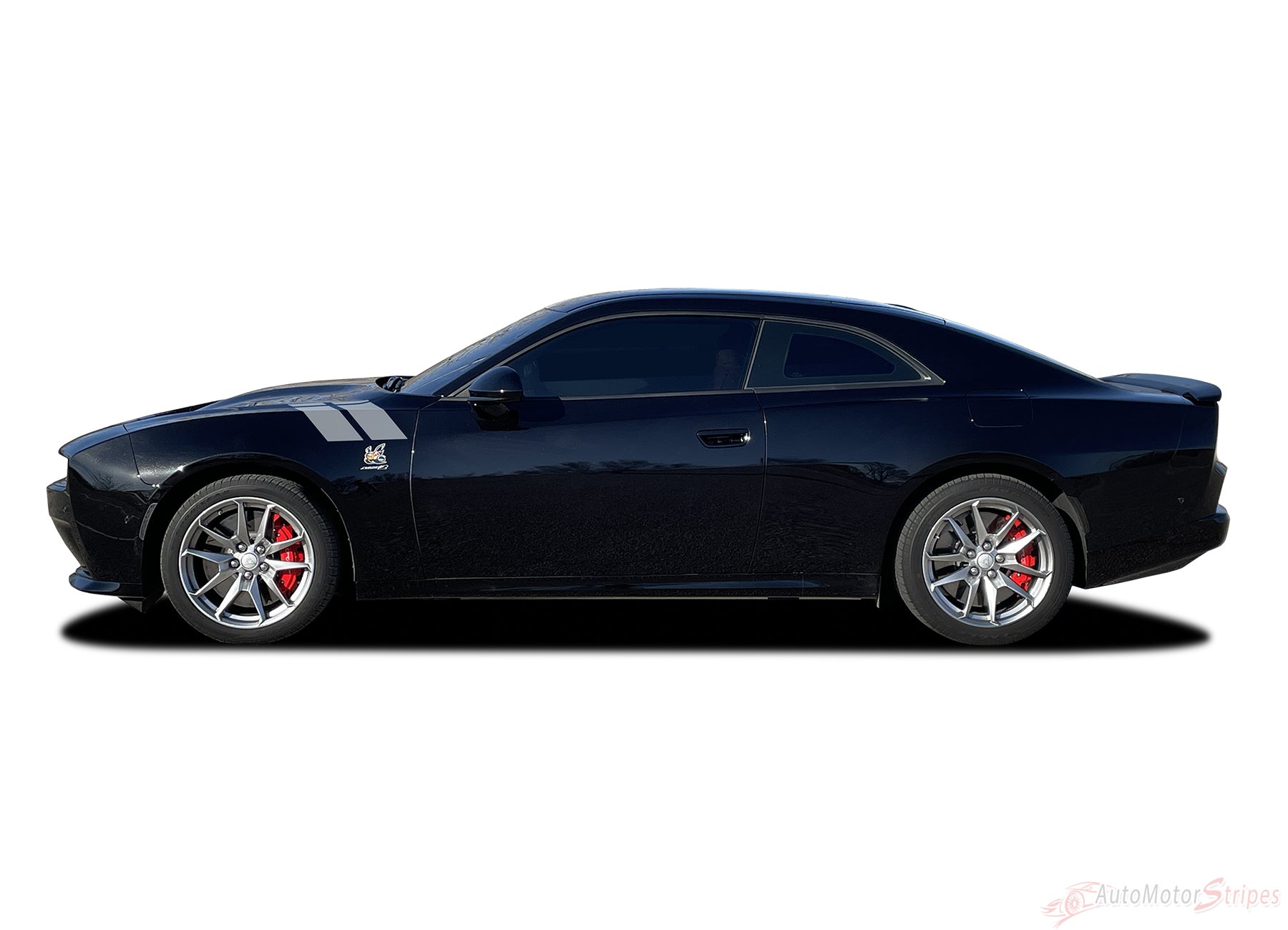 Black Dodge Charger on a white background, 2024-2026 Dodge Charger Double Bar 24 Stripes Hood Hash Marks Mopar Vinyl Graphics 3M Decals