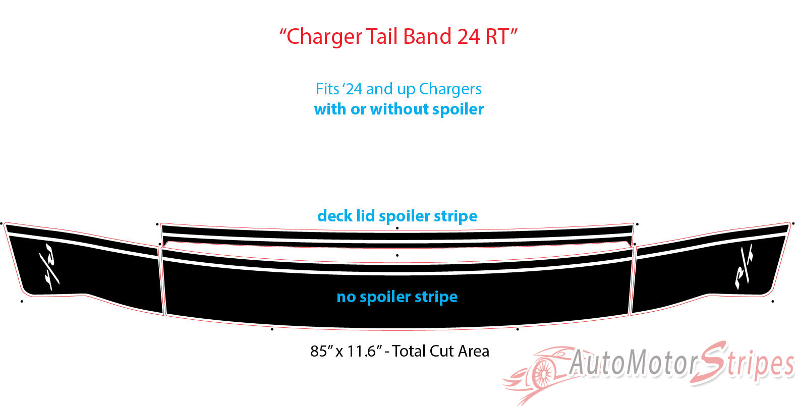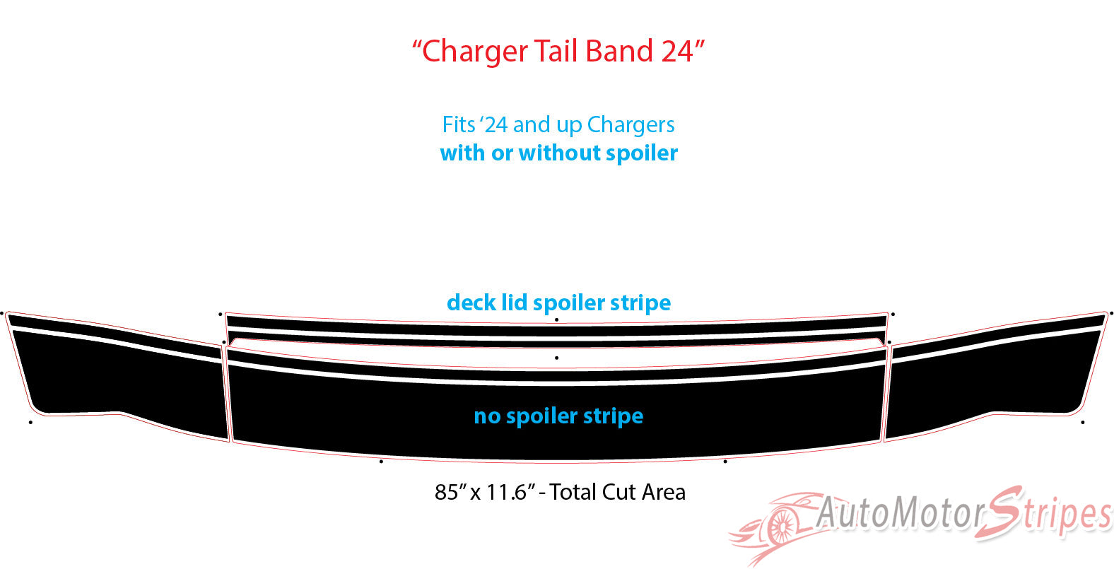 • CHARGER TAILBAND 24 vinyl striping package, brand new from AutoMotorStripes!  You have seen this OEM Hemi Daytona R/T SRT 392 Hellcat style from the factory, but now you will not find a better pre-trimmed ready to install factory OE inspired decklid trunk graphic kit on the market today! This vinyl striping design is based on the custom factory graphic kit, and is an accent decal package that has been a fast mover for dealerships and restyling shops, for installation on the current generation of vinyl graphics for the new Dodge Charger! This vinyl stripe kit has been specially and painstakingly measured for precision fitment and designed to fit the 2024 2025 Dodge Charger Hemi Daytona R/T SRT 392 Hellcat Mopar Blackout with or without dip spoiler. See precise fitment for the exact model/year mentioned above. Please remember to also choose the correct vinyl options for your particular Dodge Charger model stripe kit from those in the menu shown above. The vinyl decal sections sections included with this vehicle specific vinyl graphic kit are complete rear decklid striping as shown. You can now choose the options needed from the menu before adding to your cart, including the premium cast vinyl grade needed. This design is based on a classic, and is an exterior accessory for the Dodge Charger model and gives it a very modern day upgrade! Why did you let your Charger go so long without these vinyl graphics? You will receive many years of enjoyment with this weather resistant and durable custom factory vinyl style!