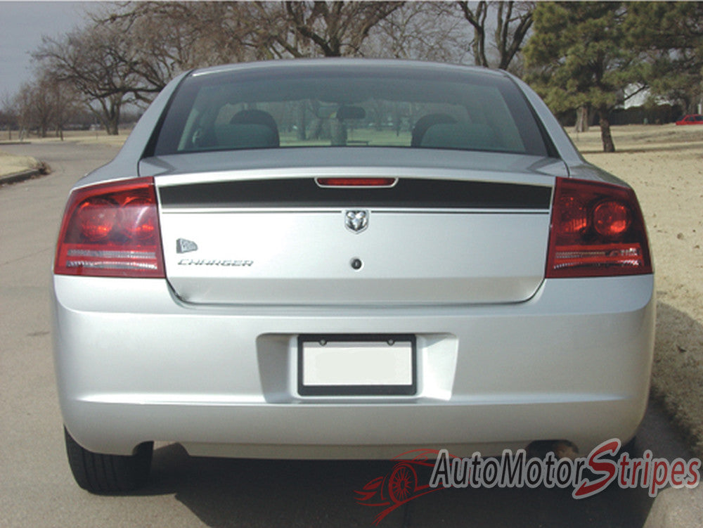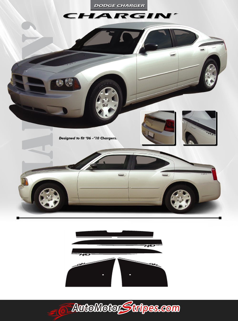 • CHARGIN vinyl striping package, brand new from AutoMotorStripes!  Have you seen this graphic on the street? You probably have, because the popularity of the vinyl graphic kit for the Charger is unparalleled! If you want to get noticed now you can purchase this OE inspired style split hood outline graphic, rear quarter panel decal, and rear trunk upper blackout graphic! This vinyl graphic design is based on the OEM factory graphic kit, and is an accent striping package and has is an extremely popular selling striping package for the current generation of vinyl graphic kits for the new Dodge Charger! This vinyl stripe kit has been specially and painstakingly measured for precision fitment and designed to fit the 2006 2007 2008 2009 2010 Dodge Charger SE, SXT, R/T, Plus, Hellcat. See precise fitment for the exact model/year mentioned above. Please remember to also choose the correct vinyl options for your particular Dodge Charger model stripe kit from those in the menu shown above. The vinyl decal sections sections included with this vehicle specific vinyl graphic kit are hood graphic rear fender quarter panel accents, and trunk graphic decal. You can now choose the options needed from the menu before adding to your cart, including the premium cast vinyl grade needed. This design is based on a classic, and is an exterior accessory for the Dodge Charger model and gives it a very modern day upgrade! Why did you let your Charger go so long without these vinyl graphics? You will receive many years of enjoyment with this weather resistant and durable custom factory vinyl style!