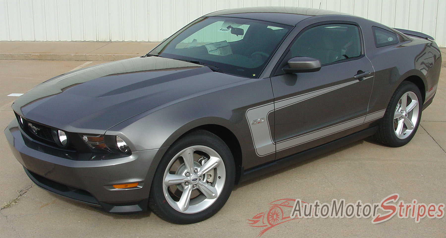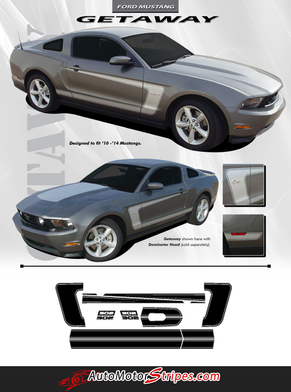 • GETAWAY vinyl graphics package, brand new from AutoMotorStripes!  This is an OEM inspired style Boss 302 "C" rally stripe kit for the Mustang, and specially precision designed to fit the 2010 2011 2012 Ford Mustang and fits the model year mentioned above. Remember to choose the correct options for your particular Ford Mustang stripe kit. The decal sections included with this vehicle specific vinyl graphic are driver and passenger side striping. Just remember to choose the options needed from the drop down menu, including the premium cast vinyl grade. Add this needed exterior accessory to the these Mustang models for a real muscle car look and feel, the Mustang just looks plain without these vinyl graphics! Durable weather resistant vinyl will add years of enjoyment for a more custom factory style!