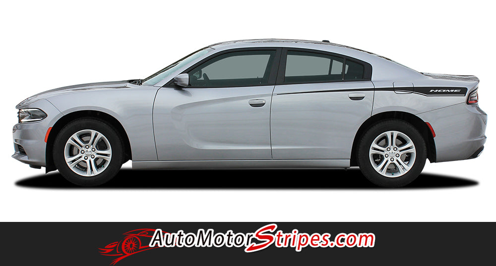 • RECHARGE QP 15 vinyl striping package, brand new from AutoMotorStripes!  You have also seen this graphic at your local automotive dealership, and now you can buy it here at discount pricing! You will not find a better pre-trimmed ready to install factory OE inspired split hood racing stripe graphic kit on the market today, it's just a fact! This vinyl striping design is based on the custom factory graphic kit, and is an accent decal package that has moved to the top of our vinyl striping sellers list, for the current generation of vinyl graphics for the new Dodge Charger! This vinyl stripe kit has been specially and painstakingly measured for precision fitment and designed to fit the 2015 2016 2017 2018 2019 2020 2021 2022 2023 Dodge Charger SE, SXT, R/T, Plus, Hellcat. See precise fitment for the exact model/year mentioned above. Please remember to also choose the correct vinyl options for your particular Dodge Charger model stripe kit from those in the menu shown above. The vinyl decal sections sections included with this vehicle specific vinyl graphic kit are hood striping and/or rear quarter panel graphic decals. You can now choose the options needed from the menu before adding to your cart, including the premium cast vinyl grade needed. This design is based on a classic, and is an exterior accessory for the Dodge Charger model and gives it a very modern day upgrade! Why did you let your Charger go so long without these vinyl graphics? You will receive many years of enjoyment with this weather resistant and durable custom factory vinyl style!