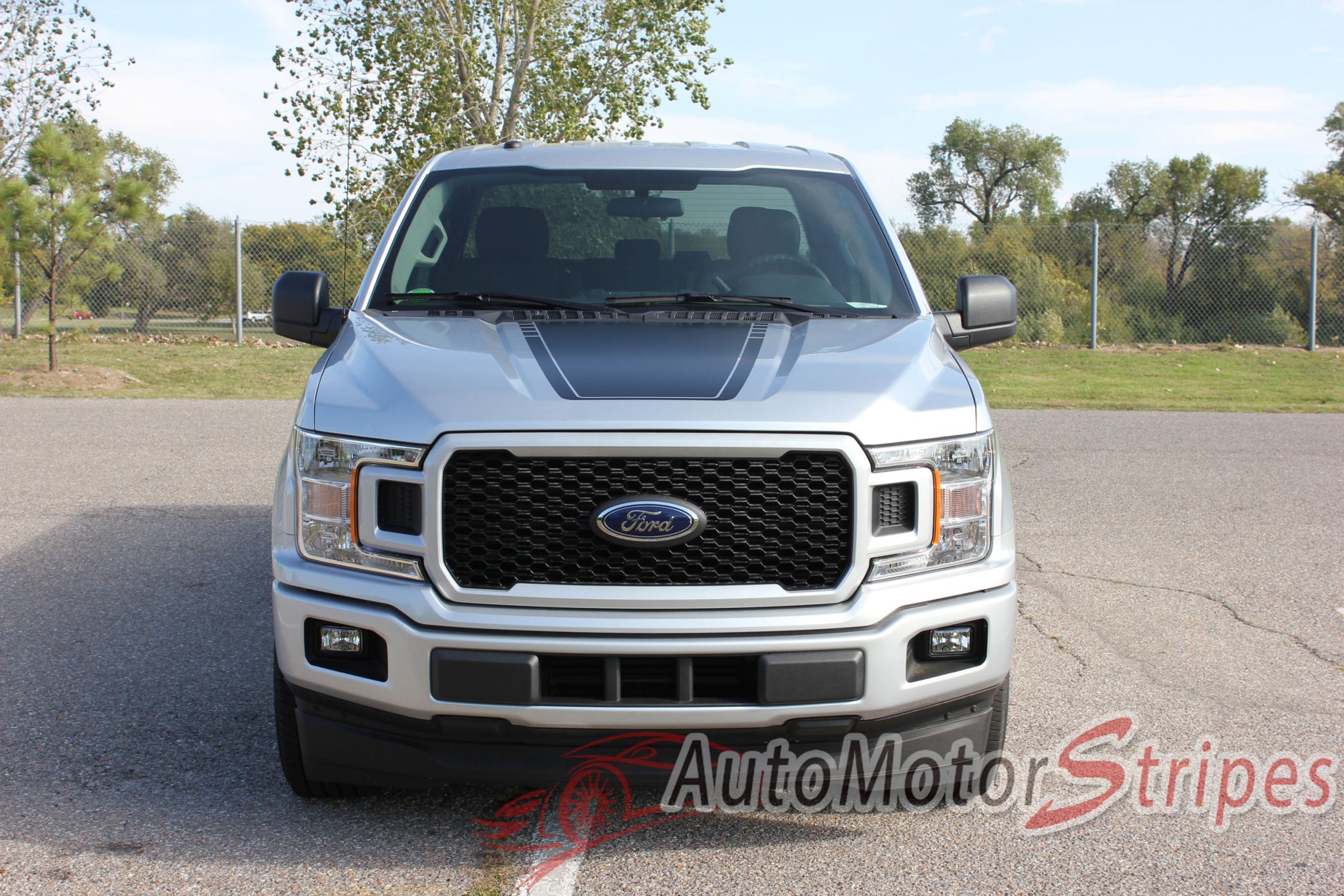 • F-150 Series SPEEDWAY HOOD vinyl graphic and striping packages, brand new from AutoMotorStripes!  Ford F-150 Series, the number one truck for over 35 years running! Do you want your new Ford truck to stand out from the other thousands on the road today? If so, add this "Lead Foot Style" Special Edition Appearance Package Style Hockey trim package vinyl graphic design! This vinyl striping graphic design has just what this Ford model needs, an upgraded custom factory OE graphic decal style, and is a very popular accent striping package for our local Ford auto dealers. These plain F-150 Series trucks need a popular selling vinyl stripe package to help these dealers sell the current generation of Ford F-150 Series! You will purchase quality vinyl, because much time, effort and skill has gone into patiently and properly measuring this vinyl graphic style for precision fitment, and designed to fit the 2015 2016 2017 2018 2019 2020 Ford F-150 Series truck. Please see precise fitment for the exact model/year mentioned above. Please remember to also choose the correct vinyl decal options for your particular Ford F-150 Series Truck model from those in the menu shown above. The vinyl decal sections sections included with this vehicle specific vinyl graphic kit are one hood vinyl graphic decal. You can now choose the options needed from the menu before adding to your cart, including the premium cast vinyl grade needed. This design is based on a classic, and is an exterior accessory for the Ford F-150 Series Truck model and gives it a very modern day upgrade! Don't let your F-150 Series go another day without these stylish vinyl graphics! You will receive many years of enjoyment with this weather resistant and durable custom factory vinyl style!