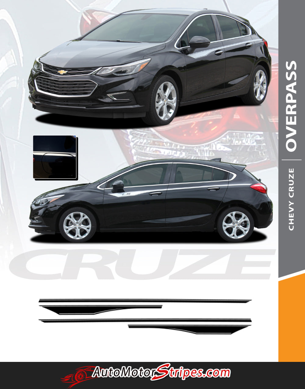 • Chevy Cruze OVERPASS vinyl graphic and striping packages, brand new from AutoMotorStripes! Now you can add this fantastic upper door accent stripe trim package vinyl graphic design which will add style to your ride! This vinyl striping graphic design has just what this Chevy model needs, an upgraded custom factory OE graphic decal style, and is a very popular accent striping package for our local Chevy auto dealers. These plain cars need a popular selling vinyl stripe package to help these dealers sell the current generation of Chevy passenger car! You will purchase quality vinyl, because much time, effort and skill has gone into patiently and properly measuring this vinyl graphic style for precision fitment, and designed to fit the 2016 2017 2018 2019 Chevy Cruze. Please see precise fitment for the exact model/year mentioned above. Please remember to also choose the correct vinyl decal options for your particular model from those in the menu shown above. The vinyl decal sections sections included with this vehicle specific vinyl graphic kit are driver and passenger side graphic decals. You can now choose the options needed from the menu before adding to your cart, including the premium cast vinyl grade needed. This design is based on a classic, and is an exterior accessory for the Chevrolet Cruze model and gives it a very modern day upgrade! Don't let your Chevy Cruze go another day without these stylish vinyl graphics! You will receive many years of enjoyment with this weather resistant and durable custom factory vinyl style!