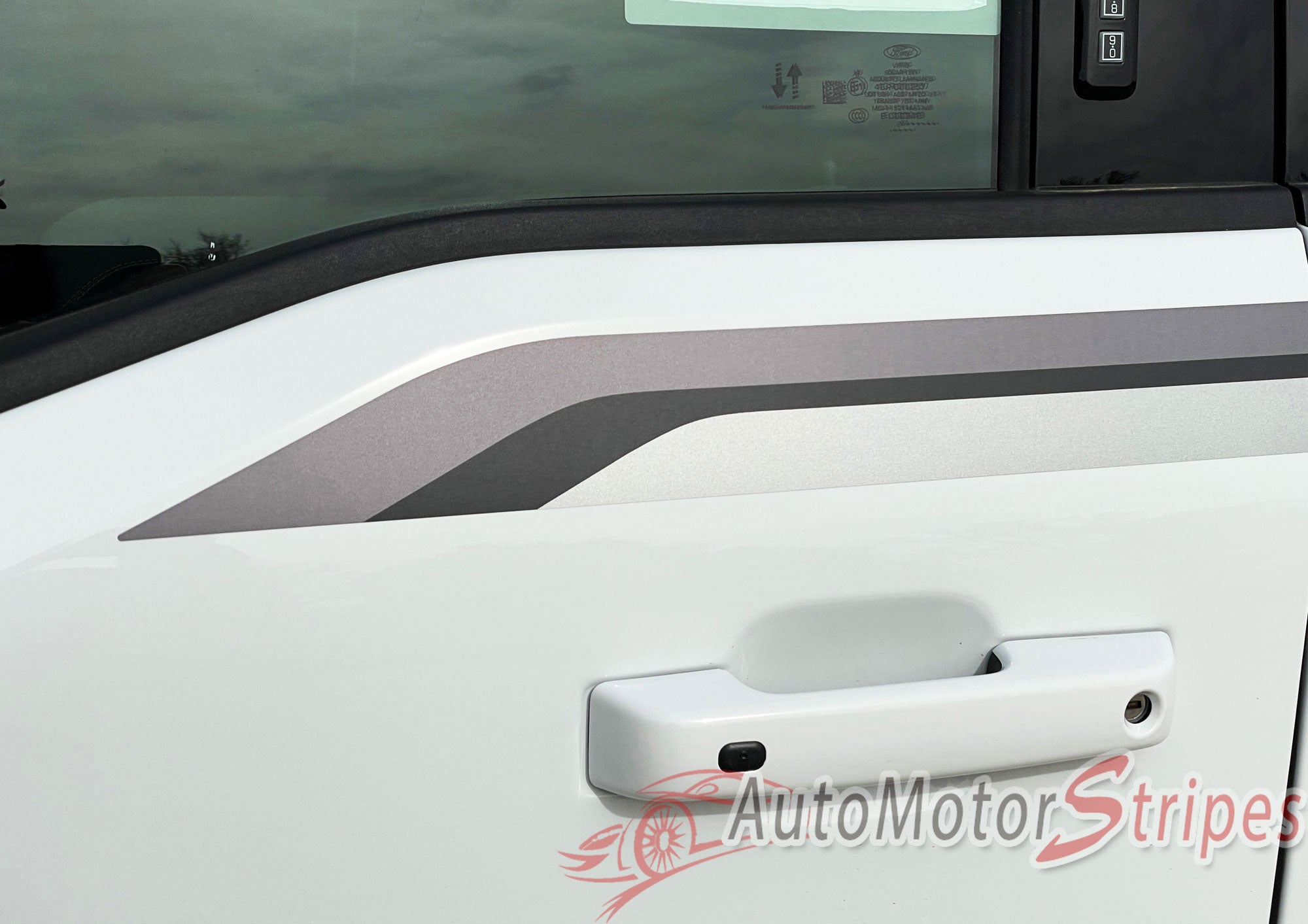Detailed view of 2021-2026 Ford F-150 FP700 Side Door Stripes Vinyl Body Decals 3M Graphics - ENFORCER BLACK/GRAY