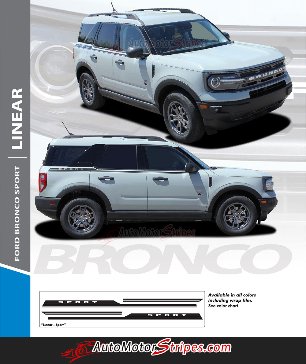 • Ford Bronco Sport LINEAR vinyl graphic and striping packages, brand new from AutoMotorStripes!  A return to the modern mid-sized truck, the new Ford Bronco is ready for the off road! This side body door accent trim package vinyl graphic design will add style and class to your Ford Bronco! This vinyl striping graphic design has just what this Ford model needs, an upgraded custom factory OE graphic decal style, and is a very popular accent striping package for our local Ford auto dealers. These cars need a popular selling vinyl stripe package to help auto dealers sell the current generation of Ford mid-sized trucks! You will purchase quality vinyl because much time, effort and skill has gone into patiently and properly measuring this vinyl graphic style for precision fitment, and designed to fit the 2021, 2022, 2023, 2024, 2025, 2026 Ford Bronco. Please see precise fitment for the exact model/year mentioned above. Please remember to also choose the correct vinyl decal options for your particular model from those in the menu shown above. The vinyl decal sections sections included with this vehicle specific vinyl graphic kit are DRIVER and PASSENGER side graphic decals. You can now choose the options needed from the menu before adding to your cart, including the premium cast vinyl grade needed. This design is based on a classic, and is an exterior accessory for the Ford Bronco model and gives it a very modern day upgrade! Don't let your Ford go another day without these stylish vinyl graphics! You will receive many years of enjoyment with this weather resistant and durable custom factory vinyl style!