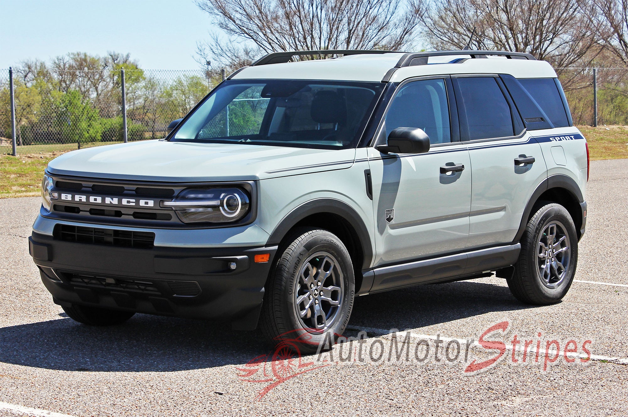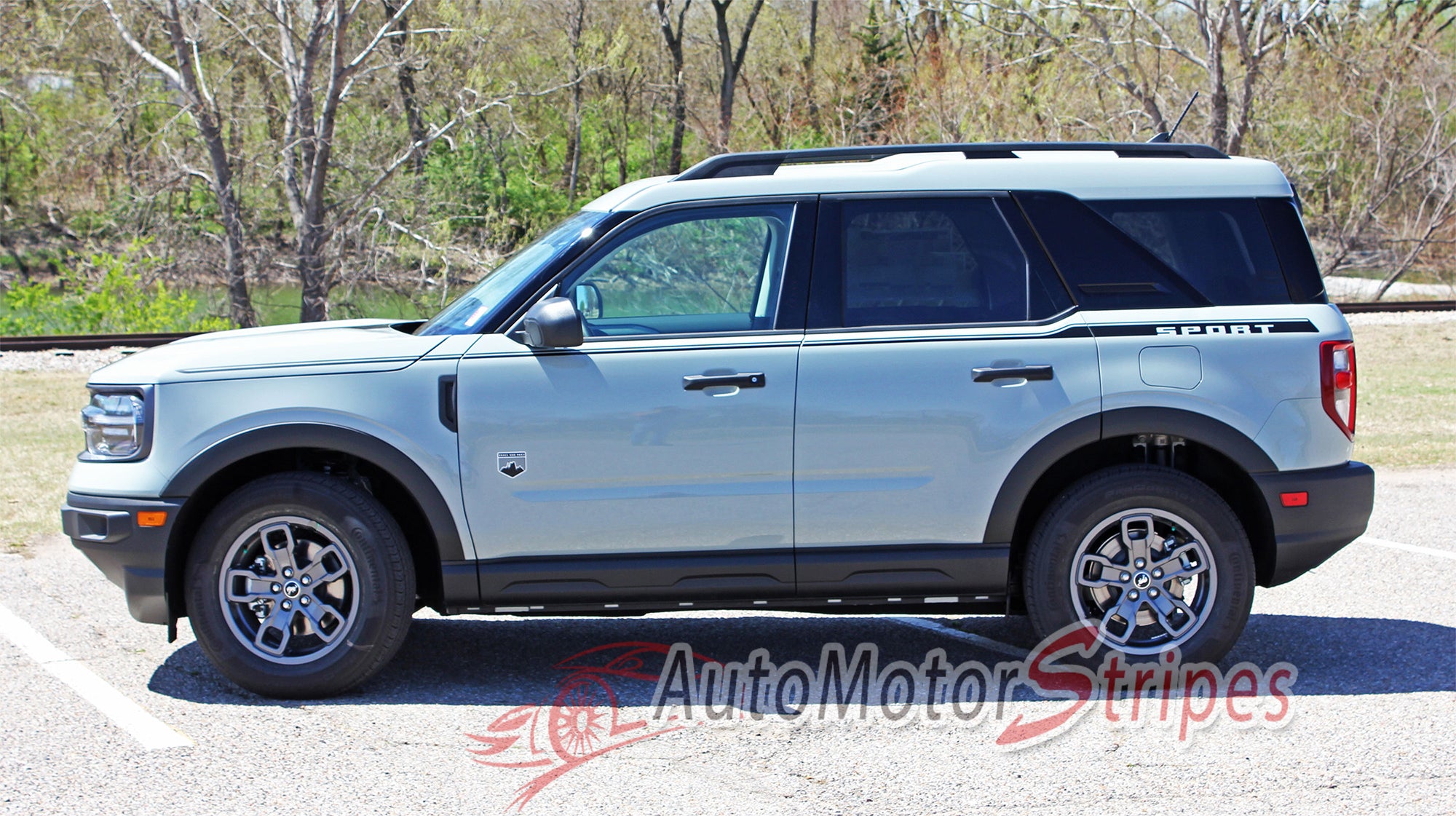 • Ford Bronco Sport RIDER vinyl graphic and striping packages, brand new from AutoMotorStripes!  A return to the modern mid-sized truck, the new Ford Bronco is ready for the off road! This side body door accent trim package vinyl graphic design will add style and class to your Ford Bronco! This vinyl striping graphic design has just what this Ford model needs, an upgraded custom factory OE graphic decal style, and is a very popular accent striping package for our local Ford auto dealers. These cars need a popular selling vinyl stripe package to help auto dealers sell the current generation of Ford mid-sized trucks! You will purchase quality vinyl because much time, effort and skill has gone into patiently and properly measuring this vinyl graphic style for precision fitment, and designed to fit the 2021, 2022, 2023, 2024, 2025, 2026 Ford Bronco. Please see precise fitment for the exact model/year mentioned above. Please remember to also choose the correct vinyl decal options for your particular model from those in the menu shown above. The vinyl decal sections sections included with this vehicle specific vinyl graphic kit are DRIVER and PASSENGER side graphic decals. You can now choose the options needed from the menu before adding to your cart, including the premium cast vinyl grade needed. This design is based on a classic, and is an exterior accessory for the Ford Bronco model and gives it a very modern day upgrade! Don't let your Ford go another day without these stylish vinyl graphics! You will receive many years of enjoyment with this weather resistant and durable custom factory vinyl style!