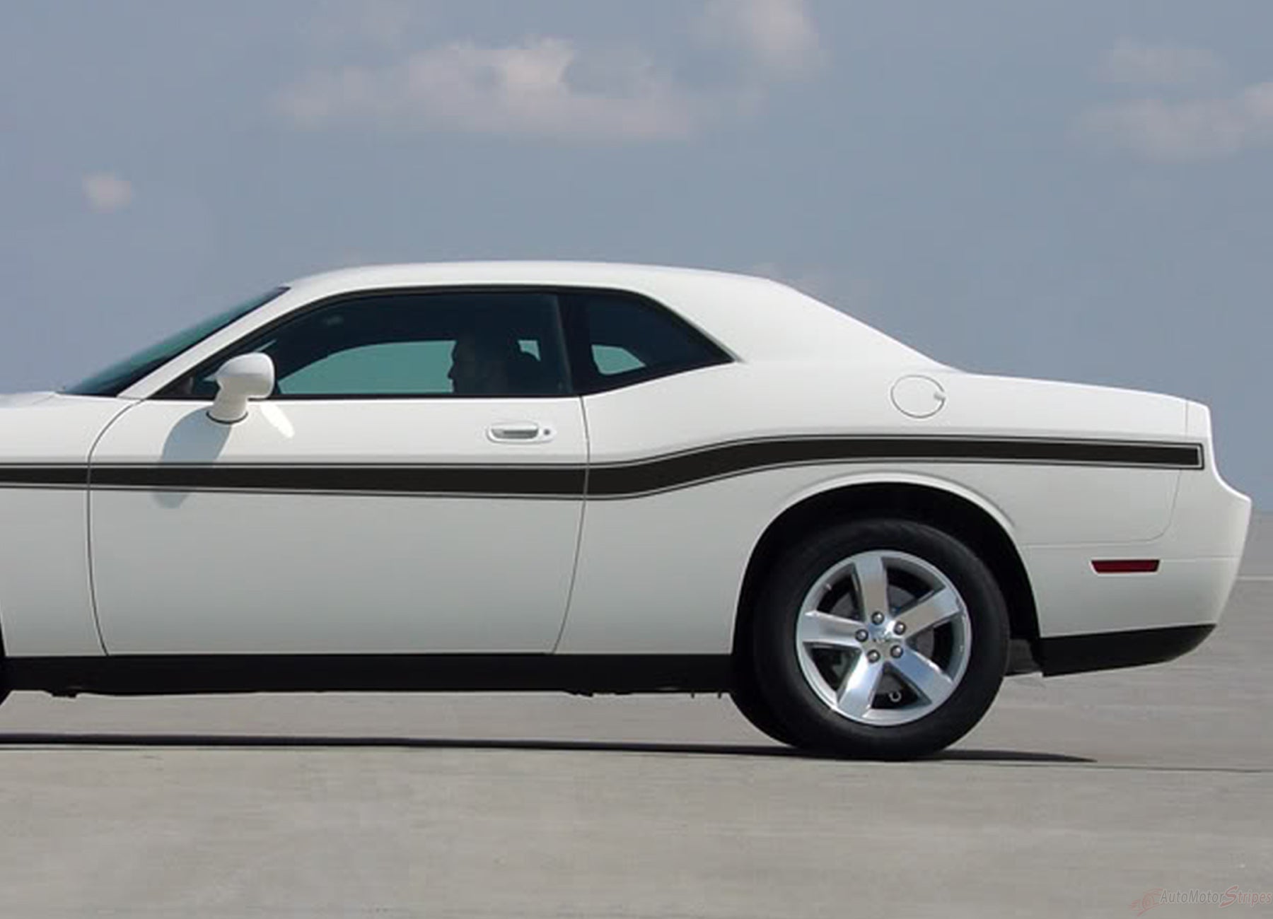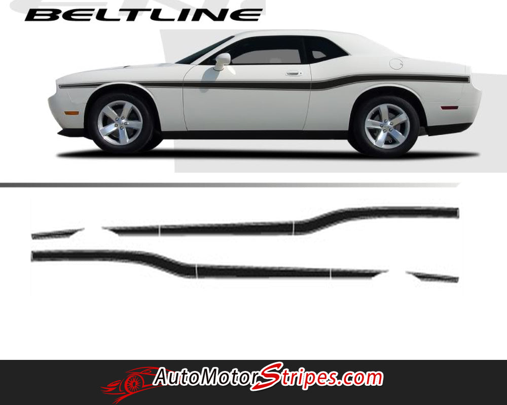 • BELTLINE vinyl striping package, brand new from AutoMotorStripes!  A tried and true vinyl graphic style based on the OEM factory side striping, this belt line upper door panel accent stripe kit is one of our longest running and best selling stripe kits for the current generation of vinyl graphic kits for the new Dodge Challenger! This vinyl stripe kit has been specially and painstakingly precision measured and designed to fit the 2008 2009 2010 2011 2012 2013 2014 2015 2016 2017 2018 2019 2020 2021 2022 2023 Dodge Challenger. See precise fitment for the exact model/year mentioned above. Please also choose the correct options for your particular Dodge Challenger model stripe kit from those in the menu above. The vinyl graphic decal sections included with this vehicle specific vinyl stripe kit are driver and passenger graphic decals. You can choose the options needed from the menu before adding to your cart, including the premium cast vinyl grade needed. Add this classic designed exterior accessory to the Dodge Challenger model for a modern 21st century look and feel! You will wonder why you let your Challenger go so long without these vinyl graphics! Add durability and weather resistance with these vinyl stripes, and add many years of enjoyment for a more custom factory style!