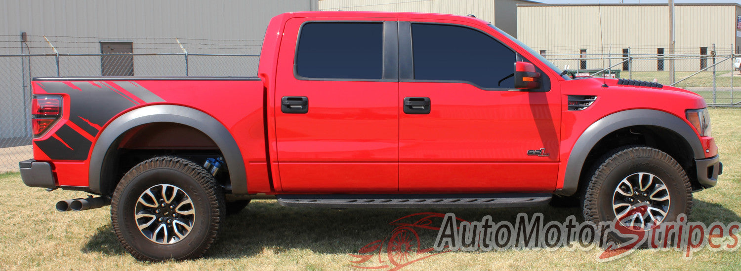 • F-150 Series PREDATOR 2 vinyl graphic and striping packages, brand new from AutoMotorStripes!  Ford F-150 Series, the number one truck for over 35 years running! Do you want your new Ford truck to stand out from the other thousands on the road today? If so, add this Raptor Style Rear Bed Mudslinger trim package vinyl graphic design! This vinyl striping graphic design has just what this Ford model needs, an upgraded custom factory OE graphic decal style, and is a very popular accent striping package for our local Ford auto dealers. These plain F-150 Series trucks need a popular selling vinyl stripe package to help these dealers sell the current generation of Ford F-150 Series! You will purchase quality vinyl, because much time, effort and skill has gone into patiently and properly measuring this vinyl graphic style for precision fitment, and designed to fit the 2009 2010 2011 2012 2013 2014 Ford F-150 Series truck. Please see precise fitment for the exact model/year mentioned above. Please remember to also choose the correct vinyl decal options for your particular Ford F-150 Series Truck model from those in the menu shown above. The vinyl decal sections sections included with this vehicle specific vinyl graphic kit are driver and passenger rear bed side graphic decals. You can now choose the options needed from the menu before adding to your cart, including the premium cast vinyl grade needed. This design is based on a classic, and is an exterior accessory for the Ford F-150 Series Truck model and gives it a very modern day upgrade! Don't let your F-150 Series go another day without these stylish vinyl graphics! You will receive many years of enjoyment with this weather resistant and durable custom factory vinyl style!