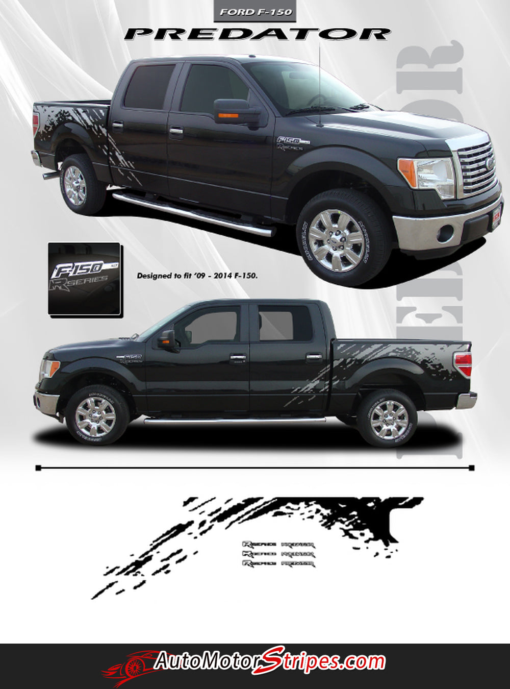 • F-150 Series PREDATOR vinyl graphic and striping packages, brand new from AutoMotorStripes!  Ford F-150 Series, the number one truck for over 35 years running! Do you want your new Ford truck to stand out from the other thousands on the road today? If so, add this Raptor Style Rear Bed Mudslinger trim package vinyl graphic design! This vinyl striping graphic design has just what this Ford model needs, an upgraded custom factory OE graphic decal style, and is a very popular accent striping package for our local Ford auto dealers. These plain F-150 Series trucks need a popular selling vinyl stripe package to help these dealers sell the current generation of Ford F-150 Series! You will purchase quality vinyl, because much time, effort and skill has gone into patiently and properly measuring this vinyl graphic style for precision fitment, and designed to fit the 2009 2010 2011 2012 2013 2014 Ford F-150 Series truck. Please see precise fitment for the exact model/year mentioned above. Please remember to also choose the correct vinyl decal options for your particular Ford F-150 Series Truck model from those in the menu shown above. The vinyl decal sections sections included with this vehicle specific vinyl graphic kit are driver and passenger rear bed side graphic decals. You can now choose the options needed from the menu before adding to your cart, including the premium cast vinyl grade needed. This design is based on a classic, and is an exterior accessory for the Ford F-150 Series Truck model and gives it a very modern day upgrade! Don't let your F-150 Series go another day without these stylish vinyl graphics! You will receive many years of enjoyment with this weather resistant and durable custom factory vinyl style!