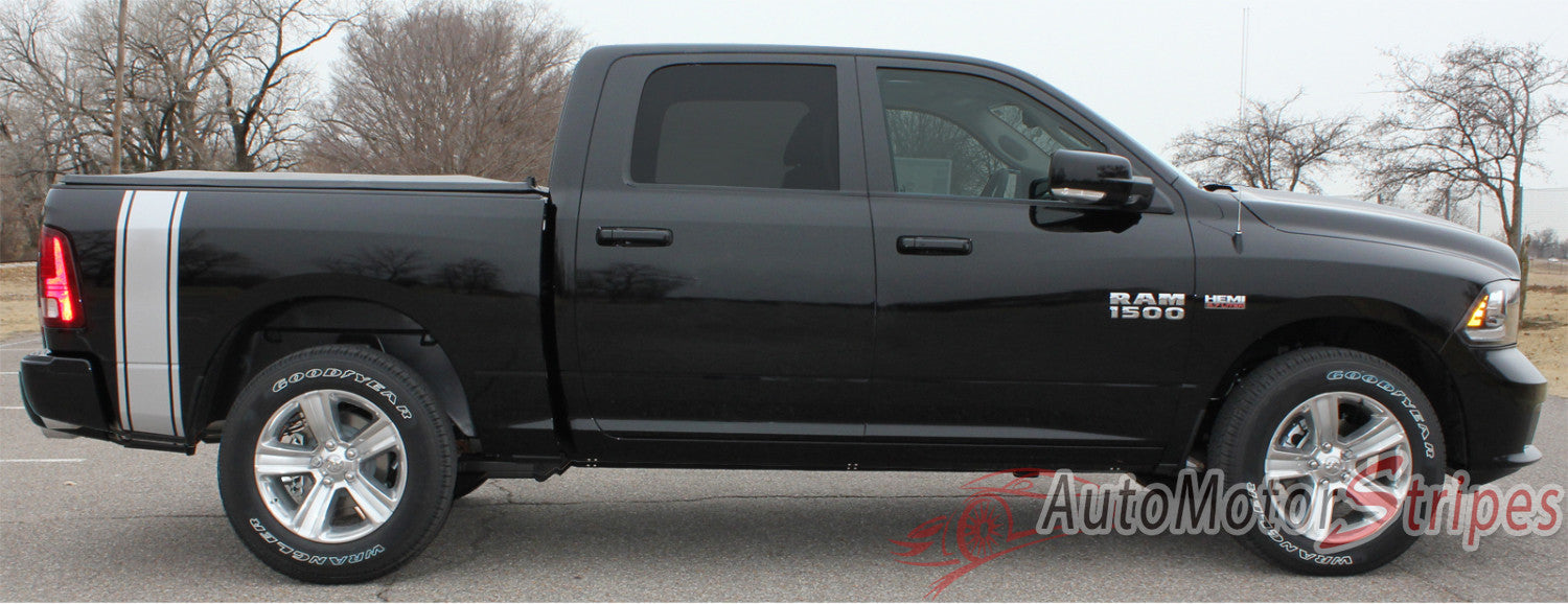 • RAM RUMBLE vinyl striping package, brand new from AutoMotorStripes!  Want to drive the biggest, baddest truck in town? Then get noticed with this rear truck bed rumble bee style vinyl graphic design! This vinyl striping design has a mean custom factory OE graphic decal style, and this modern accent striping package and has quickly become a very popular selling stripe package for the current generation of vinyl graphic kits for the new Dodge Ram! Much time, effort and patience has gone into properly measuring this vinyl graphic style for precision fitment, and designed to fit the 2009 2010 2011 2012 2013 2014 2015 2016 2017 2018 Dodge RAM 1500 and HEMI Models. See precise fitment for the exact model/year mentioned above. Please remember to also choose the correct vinyl options for your particular Dodge Ram Truck model stripe kit from those in the menu shown above. The vinyl decal sections sections included with this vehicle specific vinyl graphic kit are driver and passenger side graphic decals. You can now choose the options needed from the menu before adding to your cart, including the premium cast vinyl grade needed. This design is based on a classic, and is an exterior accessory for the Dodge Ram Truck model and gives it a very modern day upgrade! Don't let your Ram go another minute without these stylish vinyl graphics! You will receive many years of enjoyment with this weather resistant and durable custom factory vinyl style!