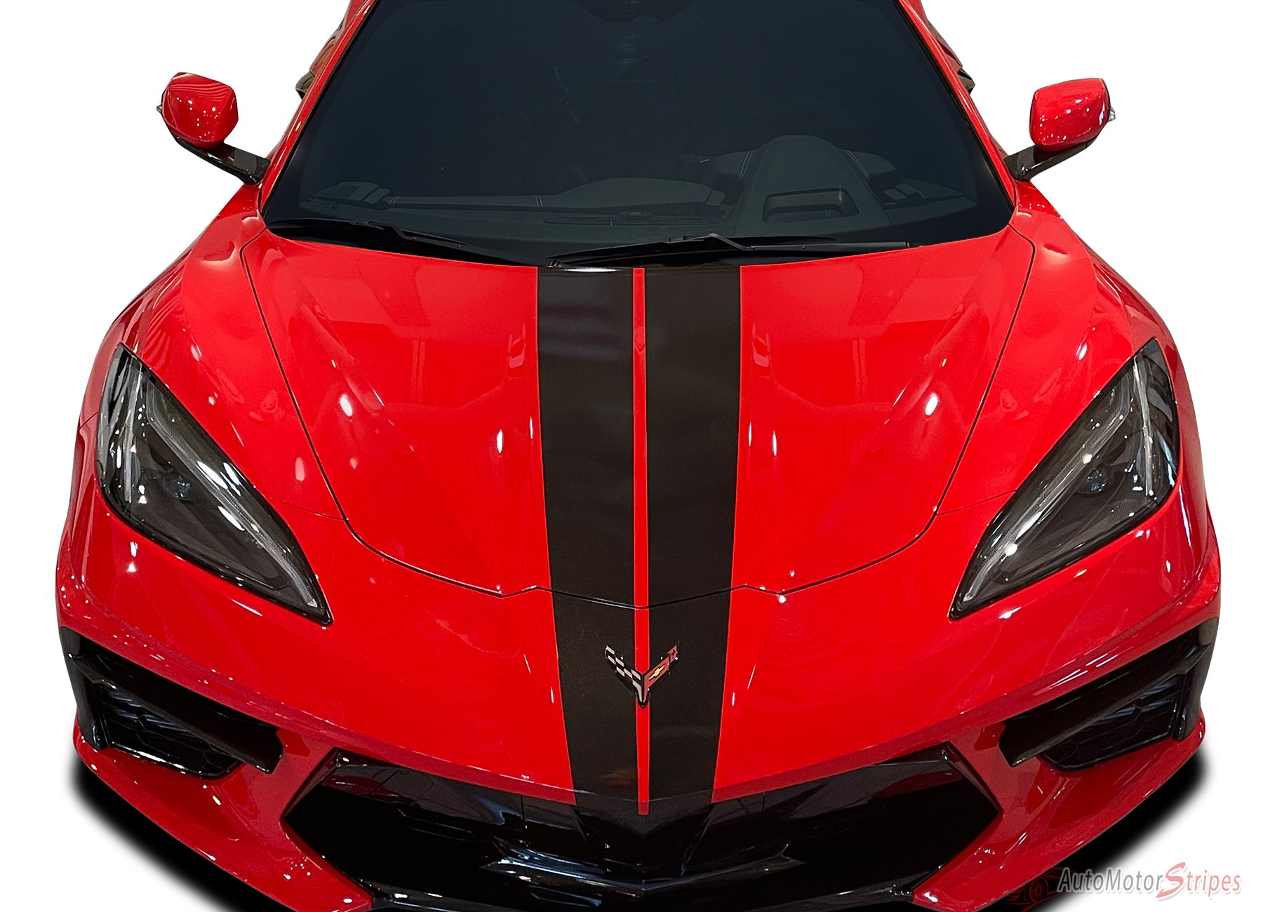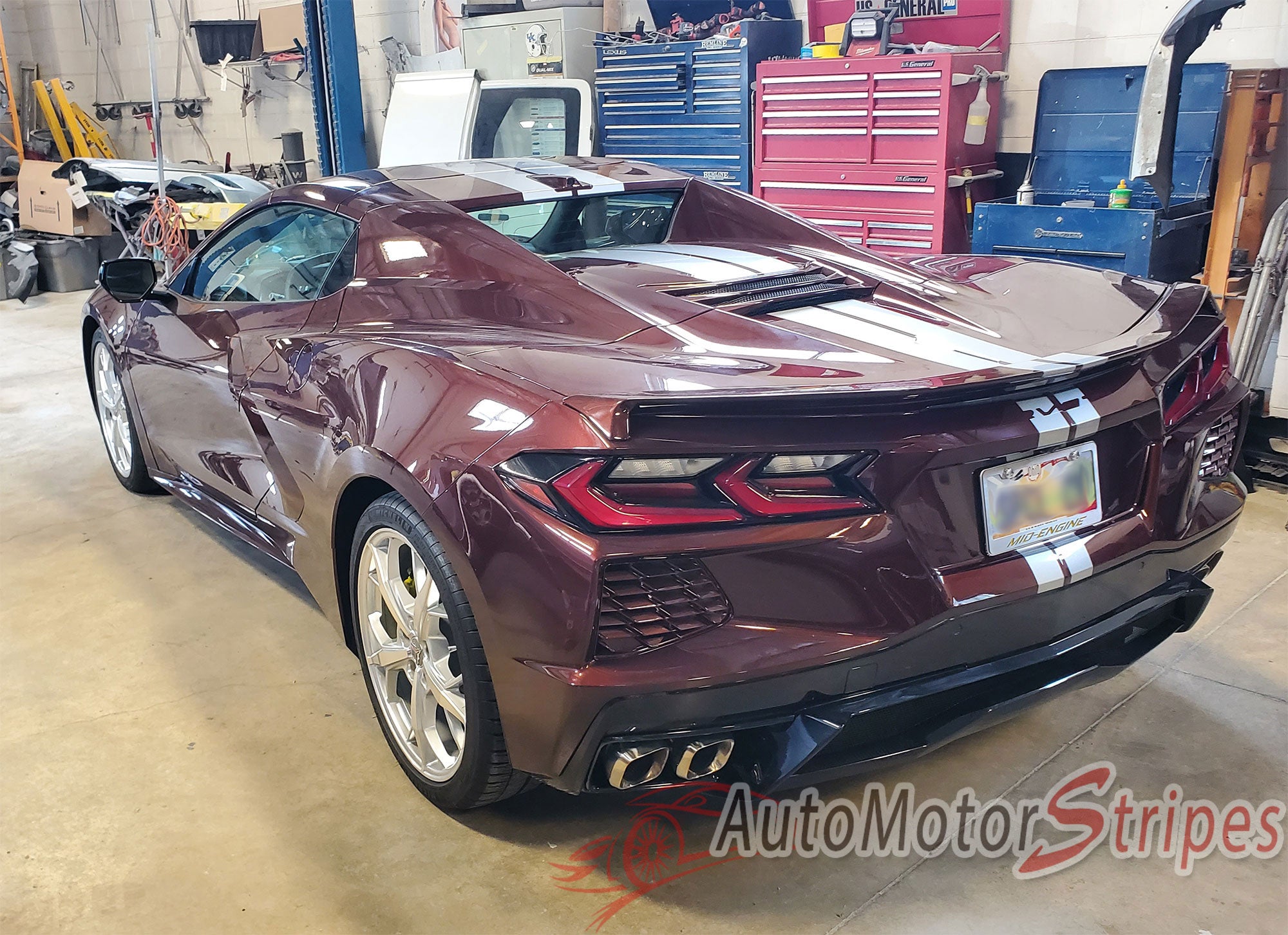 Maroon sports car Chevy Corvette C8 with white stripes in a garage setting, featuring 'AutoMotorStripes' branding.